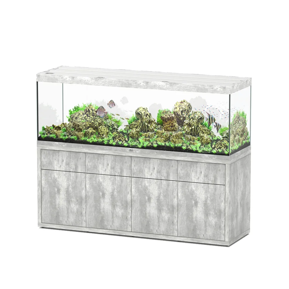 Un bel aquarium, n’est ce pas l’atout charme d’une déco d’exception qui transporte un petit morceau de nature dans votre intérieur ? Avec ses 808 litres de volume brut, cet aquarium met à votre disposition un peu moins de 680 litres d’eau de volume utile pour exprimer votre créativité. Vous pourrez créer un magnifique paysage aquatique pour que vos poissons évoluent parmi des roches, racines et massifs végétaux luxuriants. Riche en couleurs, votre aquarium animera votre salon tel un véritable tableau vivant ! L’aquarium Sublime Led 2.0 est équipé d’un filtre extérieur Cleansys 1800 Pro de nouvelle génération et de 2 chauffages Easyklim+ 300 avec thermostat ajustable. Vous pourrez ainsi associer entre 50 et 120 poissons en fonction de leur taille adulte pour peupler harmonieusement votre nouveau milieu aquatique. L’éclairage Led de haute qualité à basse consommation d’énergie qui équipe cet aquarium fournit une lumière naturelle en couvrant un spectre très proche de celui du soleil. Les plantes aquatiques bénéficiant ainsi d’excellentes conditions de croissance, vous pourrez en associer différentes variétés de différentes formes et couleurs, y compris parmi les plus exigeantes. Aquarium Sublime Led 2.0 Pro Béton L.200x P.60x H.70 cm et Meuble Sublime Béton avec 4 portes L.200x P.60x H.83 cm.