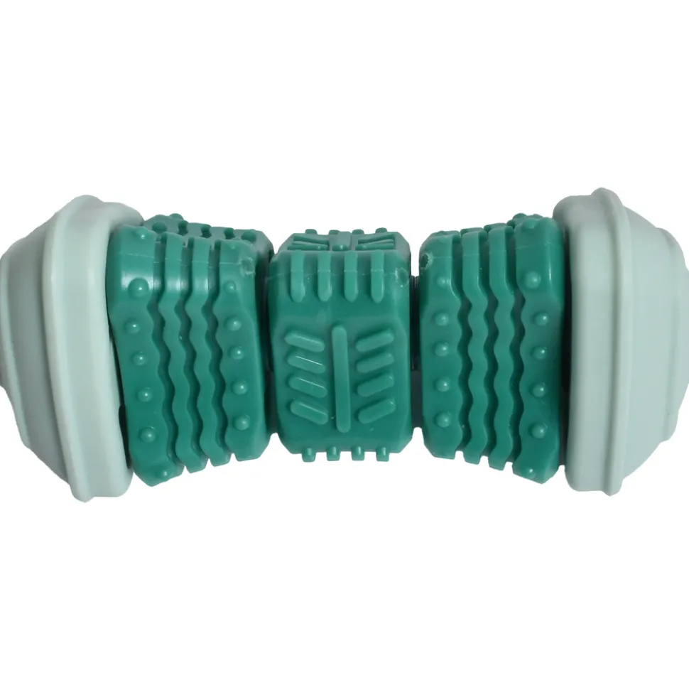 Promesse d’heures de jeu et de plaisir, ce jouet pour chien deviendra vite l’accessoire indispensable de votre petit compagnon. Il s’agit d’un jeu d’intelligence qui peut contenir de la nourriture. Ce jouet pour chien comporte en effet trois anneaux centraux qui peuvent être vissés ou dévissés pour cacher des friandises. L’animal sera alors attiré par l’odeur et mordillera l’accessoire pour récupérer les croquettes. Les anneaux sont pourvus de reliefs qui contribuent à entretenir les dents du chien pendant qu’il s’amuse avec le jouet.