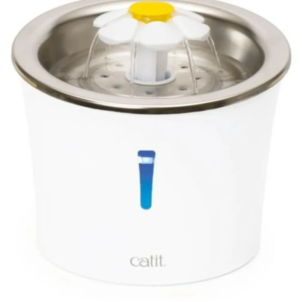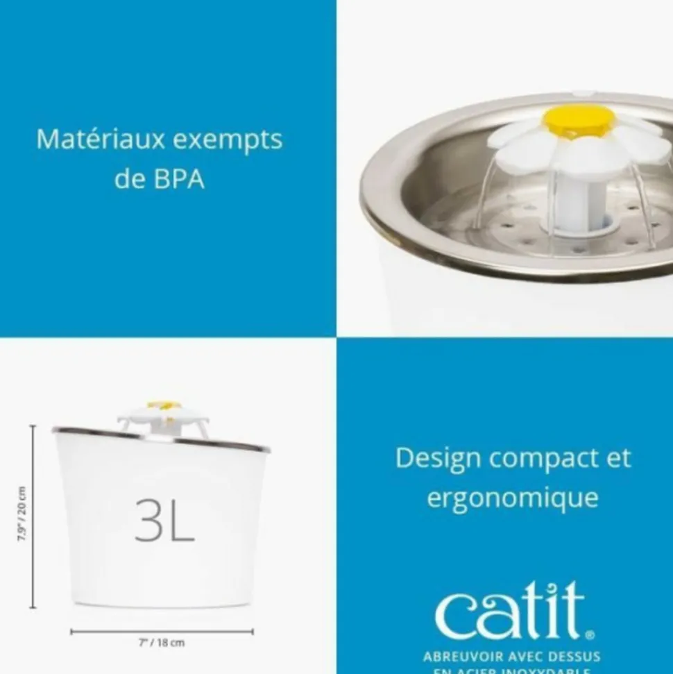 La fontaine a eau pour chat en acier inoxydable avec fleur Catit offre a votre chat une source continue d’eau propre et fraîche, favorisant son hydratation quotidienne. Son dessus peu profond en acier inoxydable garantit une hygiene optimale tout en préservant le confort de votre félin, évitant toute irritation des moustaches ou de la peau. Grâce a ses trois réglages de débit, cette fontaine s’adapte aux préférences de chaque chat, offrant un débit léger, une cascade de bulles ou un ruissellement apaisant. La fenetre avec veilleuse a LED intégrée permet de surveiller le niveau d’eau tout en guidant votre chat dans l’obscurité. Son design compact et ergonomique, doté d’un réservoir de 3 L, offre une capacité généreuse tout en occupant peu d’espace. Fabriqué en plastique sans BPA, il allie sécurité et durabilité. La fontaine est équipée d’un filtre a triple action qui purifie l’eau en continu, éliminant impuretés et odeurs pour une eau plus saine et plus attrayante pour votre chat. Elle est conçue pour fonctionner exclusivement avec les filtres a triple action Catit afin de garantir une performance optimale. Avant la premiere utilisation, il est recommandé de bien rincer le filtre et de le laisser tremper 10 minutes dans l’eau.