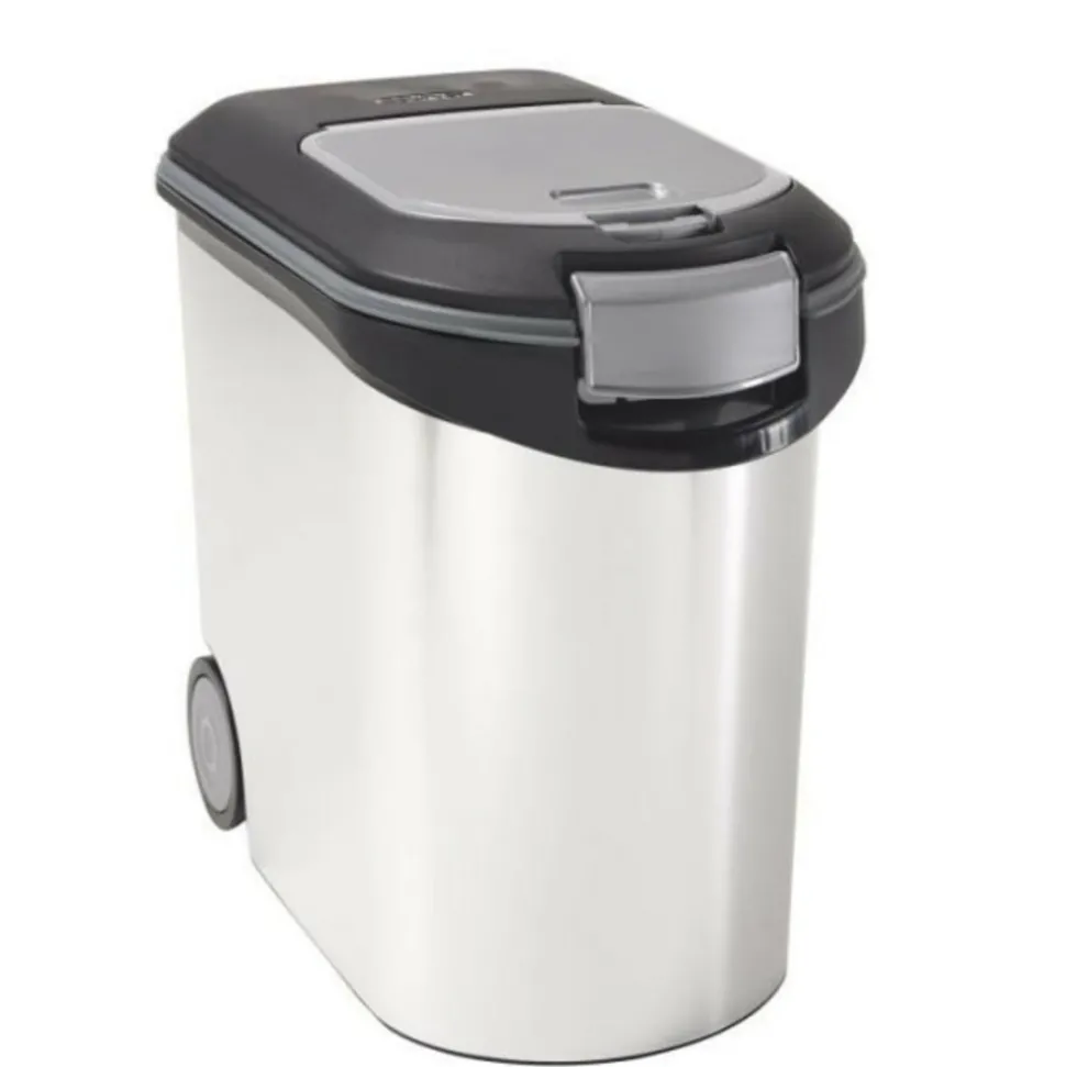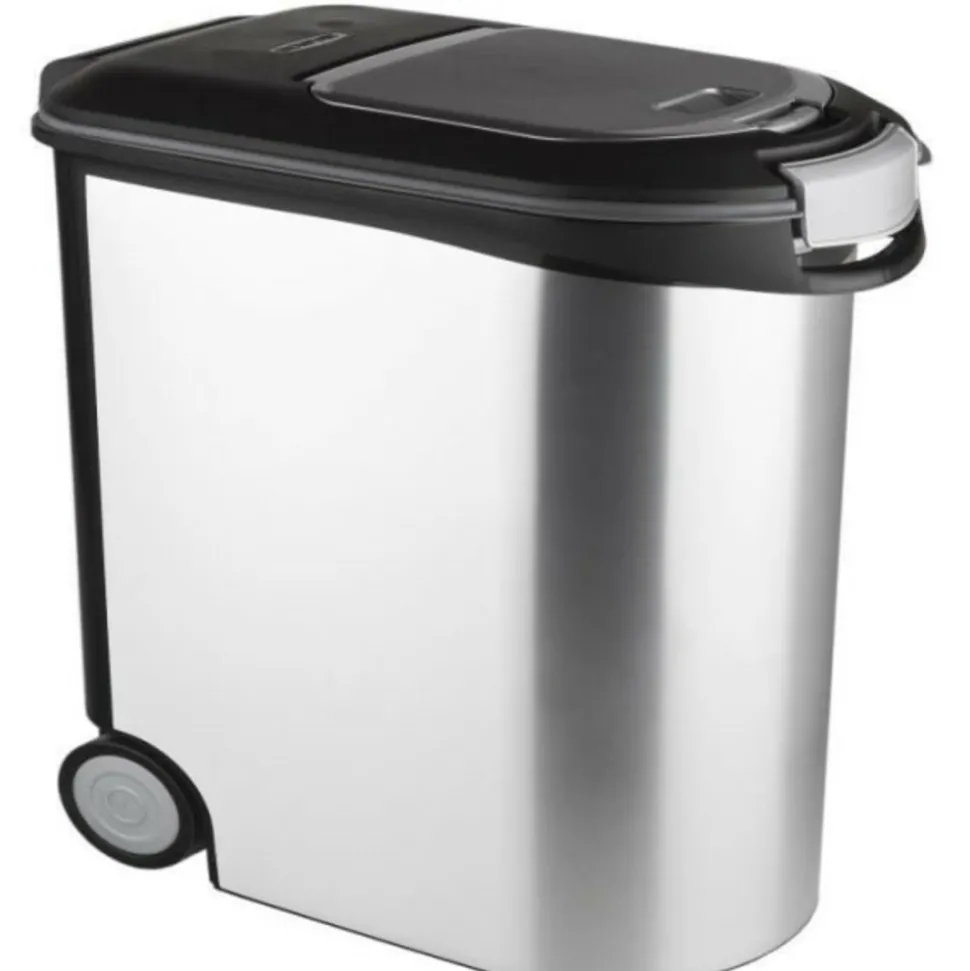 Conteneur a croquette 12kg – En polypropylene de haute qualité avec fraicheur préservée grâce a la fermeture hermétique – Grande ouverture prévue pour le rechargement des croquettes et petites ouvertures pour le versement – Aspect métal – Coloris : blanc.