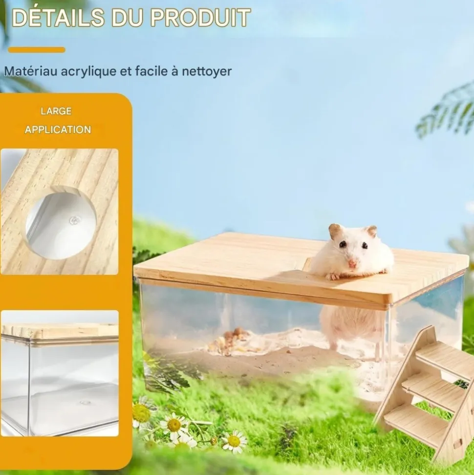 Gain de place : Ce simple bord incurvé triangulaire permet à la cage en acrylique de s’intégrer facilement dans le bord de la maison pour hamster, économisant ainsi de l’espace sans interférer avec le mouvement du hamster dans la cage.