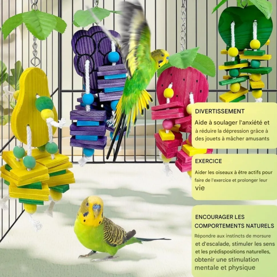 Fabriqués avec des matériaux 100% sûrs pour les animaux de compagnie : Les jouets pour oiseaux sont fabriqués avec des couleurs alimentaires et du bois naturel. Ils sont faits à la main, plus résistants à la morsure et solides.