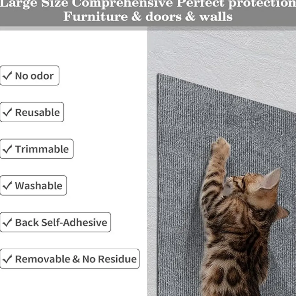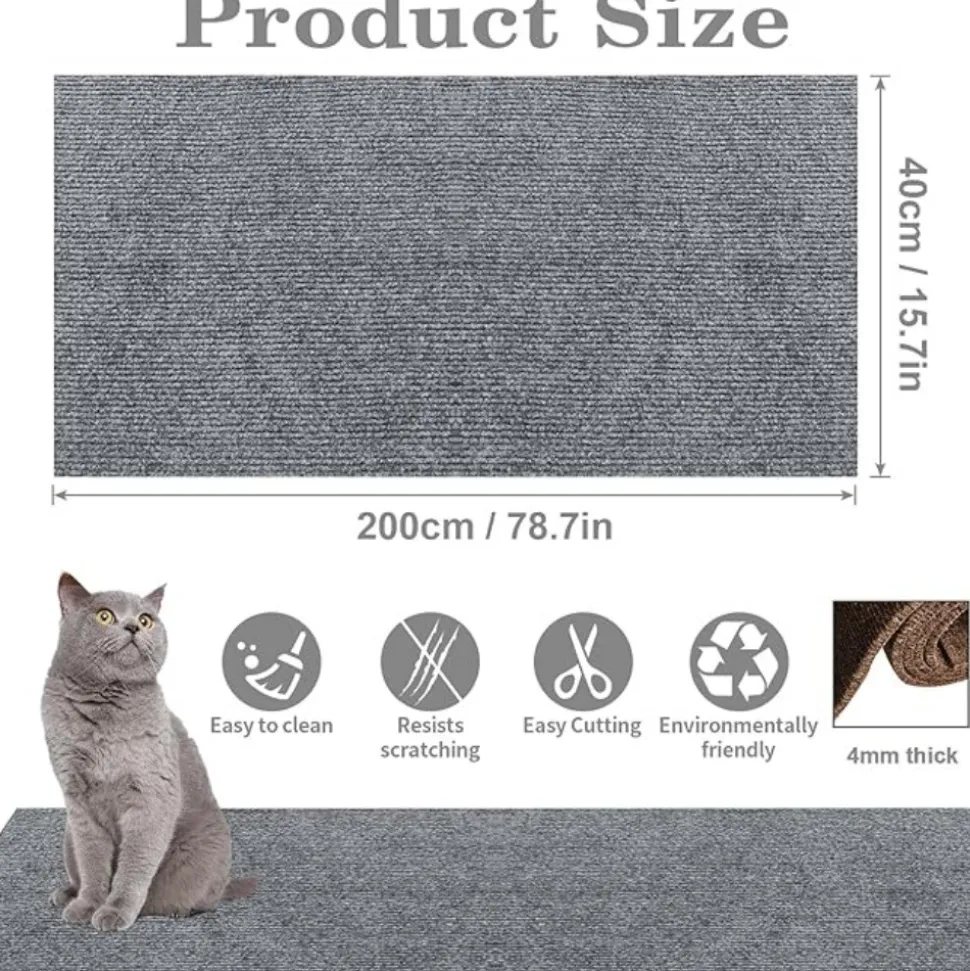 Notre griffoir autocollant pour chats est fabriqué à partir d’un matériau en fibre de polyester de haute qualité, extrêmement résistant à l’usure et à la déchirure, durable. Il offre à votre chat une surface parfaite pour gratter et exercer ses griffes tout en protégeant vos meubles des rayures.