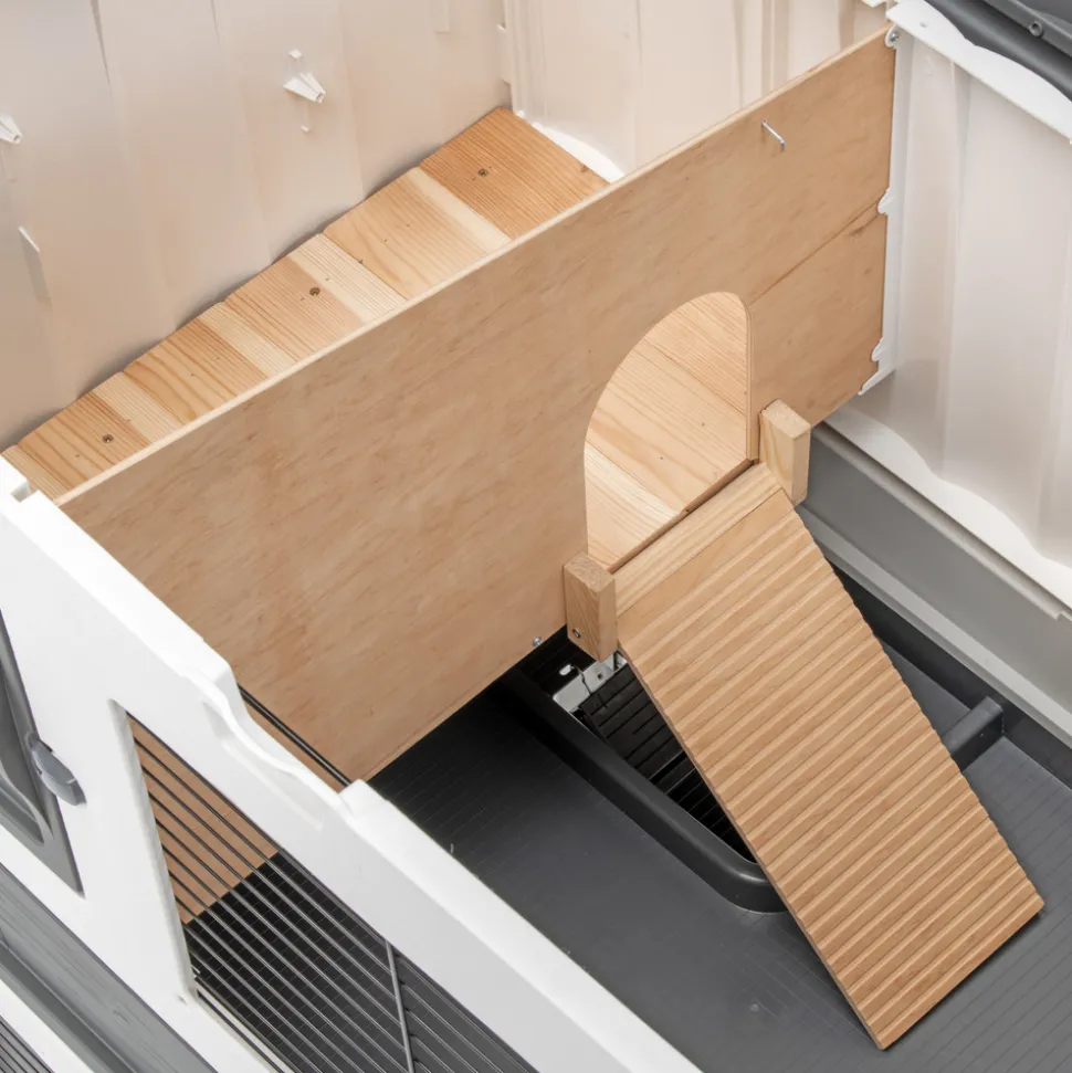 Au premier étage, vous trouverez un espace idéal pour le repos diurne, avec un grand tiroir à remplir d’épis ou de litière. De cet étage, il est possible d’accéder à la maison des lapins via une échelle, équipée d’une porte qui peut être ouverte de l’extérieur pour une inspection rapide.