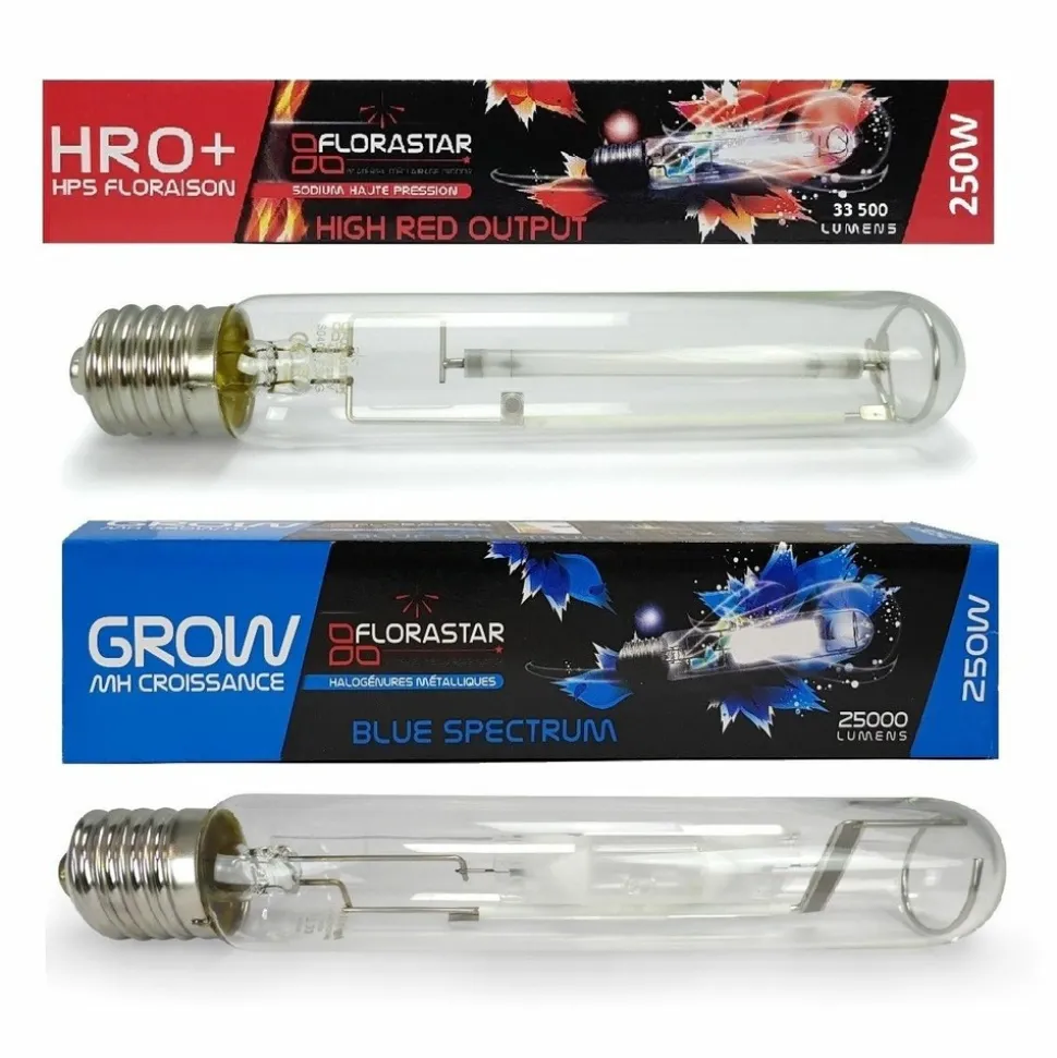 Ce lot contient 2 ampoules 250W Florastar, une Métal Halid qui s’utilisera lors de la croissance des végétaux cultivés en intérieur et une HRO pour la période de floraison.