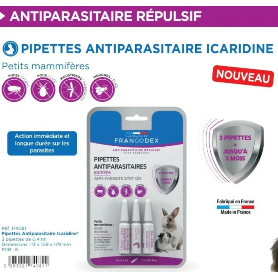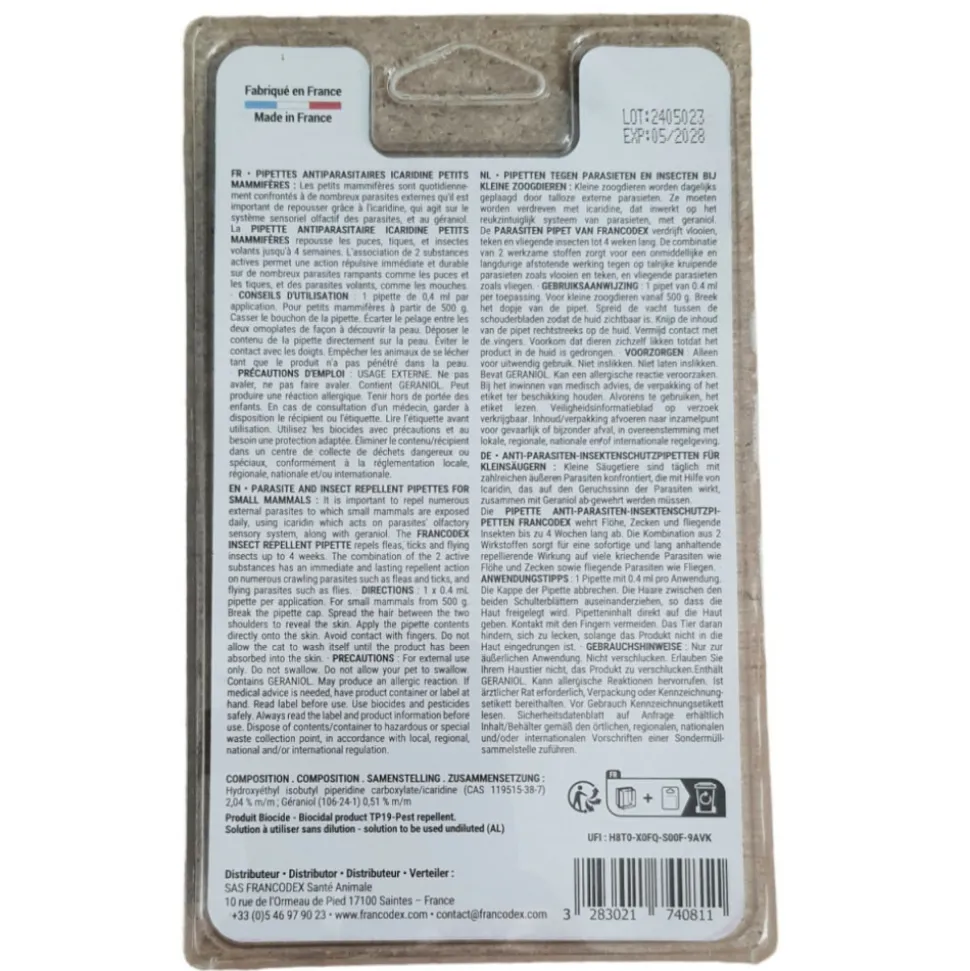 - La PIPETTE ANTIPARASITAIRE ICARIDINE PETITS MAMMIFÈRES repousse les puces, tiques, et insectes volants jusqu’à 4 semaines.