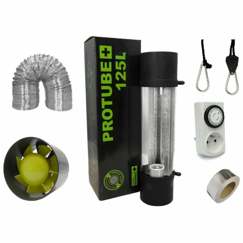 Un réflecteur Protube Garden Highpro 125mm non câblé.Un extracteur d’air Profan 190m3/h avec câble.10 mètres de gaine alu Ø 125mm.Un rouleau d’adhésif de ventilation alu 10 mètres.Un programmateur journalier à encoches.Une paire de suspension max 5 kilos.