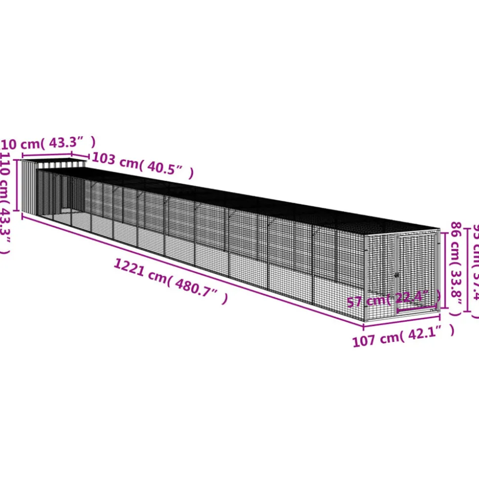 Ce poulailler avec cour est un choix parfait pour vos poulets, poules et autres petits animaux et les maintient à l’aise. Utilisation polyvalente : combiné avec la cour étendue, le poulailler polyvalent offre beaucoup d’espace à vos poules. Il présente de multiples utilisations : jouer, faire de l’exercice ou simplement garder vos poules en sécurité. Ce sera le paradis de jeu parfait pour vos animaux !Construction durable : grâce à sa construction robuste en acier galvanisé, le poulailler est durable et fait pour durer. Conception en maille : la conception en maille du poulailler aide à prévenir les méfaits et les accidents inattendus tout en permettant la ventilation. Toit pratique : le toit du poulailler protège les poulets du soleil, de la pluie, de la neige et d’autres conditions météorologiques. Accès pratique : il y a une entrée à la maison pour animaux et une porte avec un loquet sur la cour prolongée, les deux facilitant l’entrée et la sortie. Couleur : anthracite Matériau : acier galvanisé Dimensions totales : 110 x 1221 x 110 cm (l x P x H) Poulailler : Dimensions extérieures : 110 x 103 x 110 cm (l x P x H) Dimensions intérieures : 104 x 90 x 107 cm (l x P x H) Taille de l’entrée : 47 x 80 cm (l x H) Cour étendue : Dimensions extérieures : 107 x 1110 x 95 cm (l x P x H) Dimensions intérieures : 104 x 1120 x 92 cm (l x P x H) Dimensions de la porte : 57 x 86 cm (l x H) L’assemblage est requis La livraison contient : 1 x poulailler 1 x cour étendue