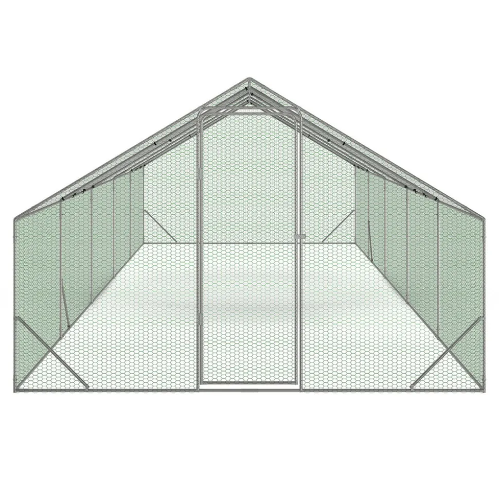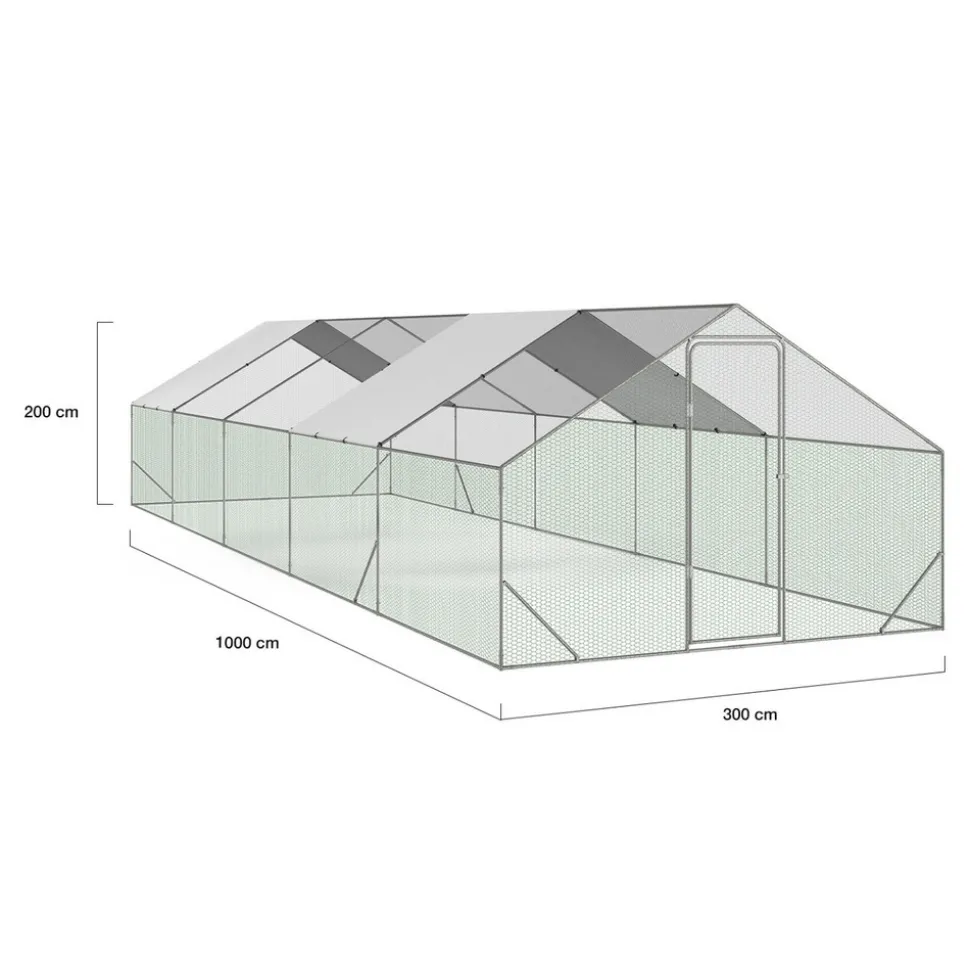 Vous disposez d’un grand nombre de poules ou d’animaux de basse-cour ? Vous souhaitez protéger tout votre élevage en leur offrant un nouvel espace pour qu’ils se sentent à l’aise dans un grand espace ? Avec cet enclos de 30m², profitez d’une zone de promenade très étendue tout en restant sécurisée.Avec cette clôture grillagée vous mettez l’ensemble de vos poules et autres animaux de basse-cour à l’abri des prédateurs. Renards, chiens, chats et oiseaux de proie seront incapables d’attaquer vos volailles.Grâce aux deux bâches de toit imperméable en polyester et anti-UV, vos gallinacés sont protégés non seulement de la pluie, mais également du soleil l’été. Offrez à la fois une très grande aire de détente et un abri pour vos poules et autres oiseaux de basse-cour où ils pourront s’ébattre en toute sécurité.Cet enclos grillagé pour poules peut accompagner vos poulaillers en bois ce qui permet d’offrir un cadre de vie naturel à vos animaux. Accédez facilement à l’enclos des poules grâce à sa porte sécurisée avec loquet et allez ainsi récupérer les œufs de vos volatiles sans risquer de les voir s’échapper.Facile à monter et d’une très grande superficie de 30m², la volière en acier vous permet d’élever une vingtaine de poules dans votre jardin.Astuce : pensez à ancrer votre enclos avec des sardines pour qu’aucun intrus ne puisse creuser et passer par dessous sous votre grillage.Nous vous conseillons en cas d’intempéries de retirer la bâche afin de prévenir le risque de stagnation d’eau.Dimensions de l’enclos poulailler 30 m² parc grillagéDimensions totales hors tout : Longueur 1000 cm x largeur 300 cm x Hauteur 200 cmDimensions de la porte : Longueur 60 cm x Hauteur 170 cmSurface : 30 m²Matériaux : Structure et grillage en acier galvanisé, filet, brise-soleil en polyéthylèneColoris : Structure grise, grillage vert, filet noir, brise-soleil blancConnecteurs : 22 mmGrillage sur les côtés + filet sur le toit2 brise-soleil en tissu imperméable et protection anti-UV : 340 x 190 mÀ monter soi-mêmePour plus de facilité de montage, nous vous conseillons d’être 2 personnes (temps estimé : 120 min).Poulaillers en bois vendus séparément sur notre boutique en ligne.Découvrez également toute notre gamme d’enclos poulaillers sur notre boutique en ligne !