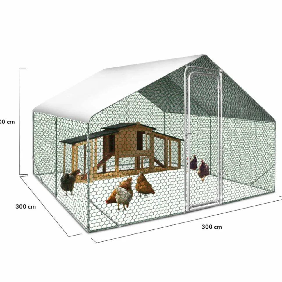 Vous souhaitez protéger votre élevage de volailles en leur offrant un nouvel espace ? Ajoutez un enclos au poulailler d’extérieur, pour une zone de promenade étendue et surtout sécurisée. Avec cette clôture grillagée vous mettez vos poules et autres animaux de basse-cour à l’abri des prédateurs. Renards, chiens, chats et oiseaux de proie seront incapables d’attaquer vos volailles.Grâce à une bâche de toit imperméable en polyester et anti-UV, vos gallinacés sont protégés non seulement de la pluie, mais également du soleil l’été. Offrez à la fois une aire de détente et un abri pour vos poules et autres oiseaux de basse-cour où ils pourront s’ébattre en toute sécurité.Cet enclos grillagé pour poules peut accompagner votre poulailler en bois ce qui permet d’offrir un cadre de vie naturel à vos animaux. Accédez facilement à l’enclos des poules grâce à sa porte sécurisée avec loquet et allez ainsi récupérer les œufs de vos volatiles sans risquer de les voir s’échapper.Facile à monter et d’une grande superficie de 9 M², la volière en acier vous permet d’élever entre 6 et 8 poules dans votre jardin.Astuce : pensez à ancrer les pieds de votre enclos pour qu’aucun intrus ne puisse creuser et passer par dessous sous votre grillage.N’hésitez plus, protégez vos poules ou animaux de basse-cour et offrez leur de l’espace ! Nous vous conseillons en cas d’intempéries de retirer la bâche afin de prévenir le risque de stagnation d’eau.Dimensions de l’enclos poules 9 m² parc grillagé 3×3 mDimensions totales hors tout : Longueur 300 cm x largeur 300 cm x Hauteur 200 cmDimensions de la porte : L. 60 x H. 170 cmMatériaux : Structure et grillage en acier galvanisé, filet, brise-soleil en polyéthylèneColoris : Structure grise, grillage vert ou gris selon arrivage, filet noir, brise-soleil blancDiamètre des tubes de la structure : 19 mm – D. 0.6 mmConnecteurs 22 mmGrillage triple torsion sur les côtés + filet sur le toit1 brise-soleil en tissu imperméable et protection anti-UV : 340 x 290 cm8 piquets d’ancrage4 jambes de forceÀ monter soi-mêmePour plus de facilité de montage, nous vous conseillons d’être 2 personnes (temps estimé : 60 min).Poulaillers en bois vendu séparément sur notre boutique en ligneRetrouvez toutes nos différentes tailles d’enclos disponibles sur notre boutique en ligne :- Enclos poulailler 3m² parc grillagé- Enclos poulailler 6 m² parc grillagé- Enclos poulailler 12 m² parc grillagé- Enclos poulailler 16 m² parc grillagé- Enclos poulailler 18 m² parc grillagé- Enclos poulailler 24 m² parc grillagéDécouvrez également toute notre gamme d’enclos poulaillers sur notre boutique en ligne !
