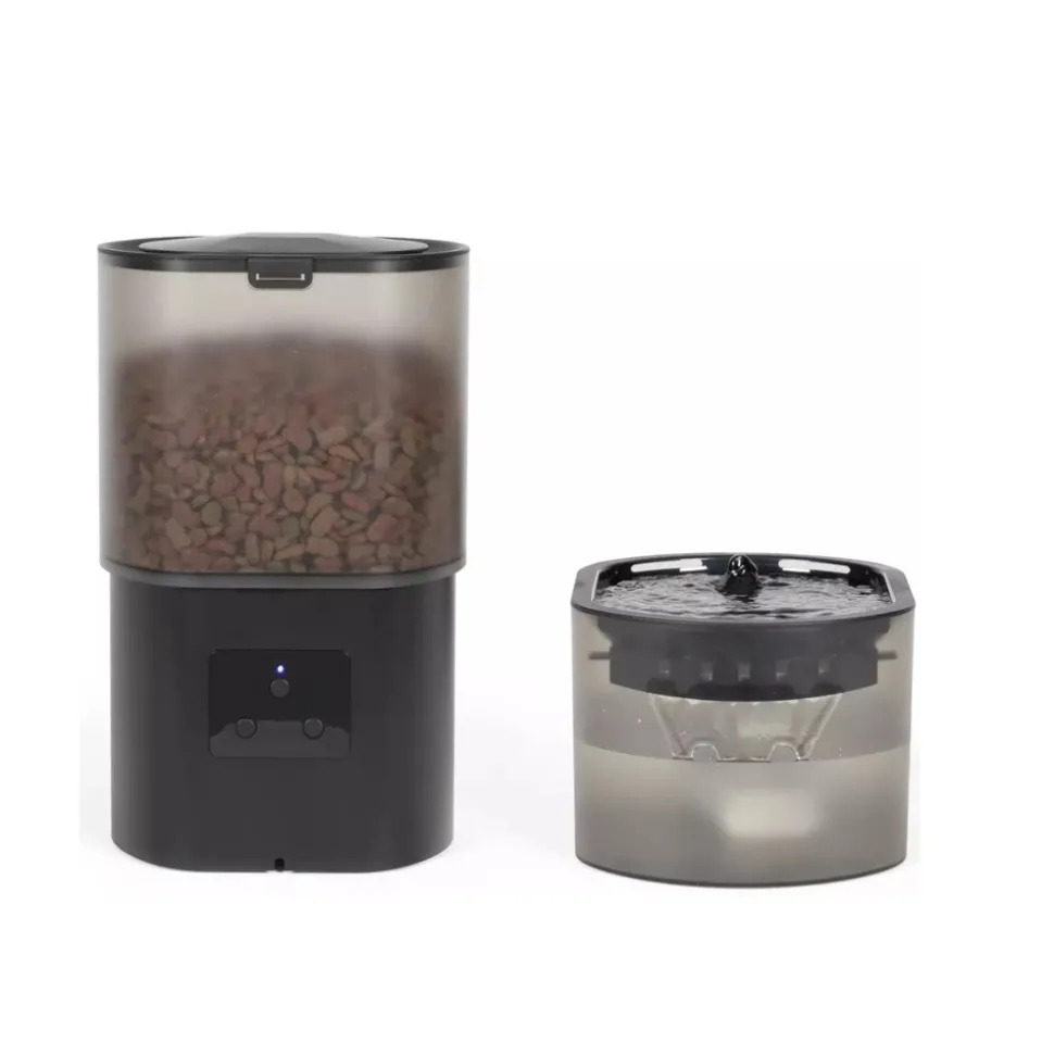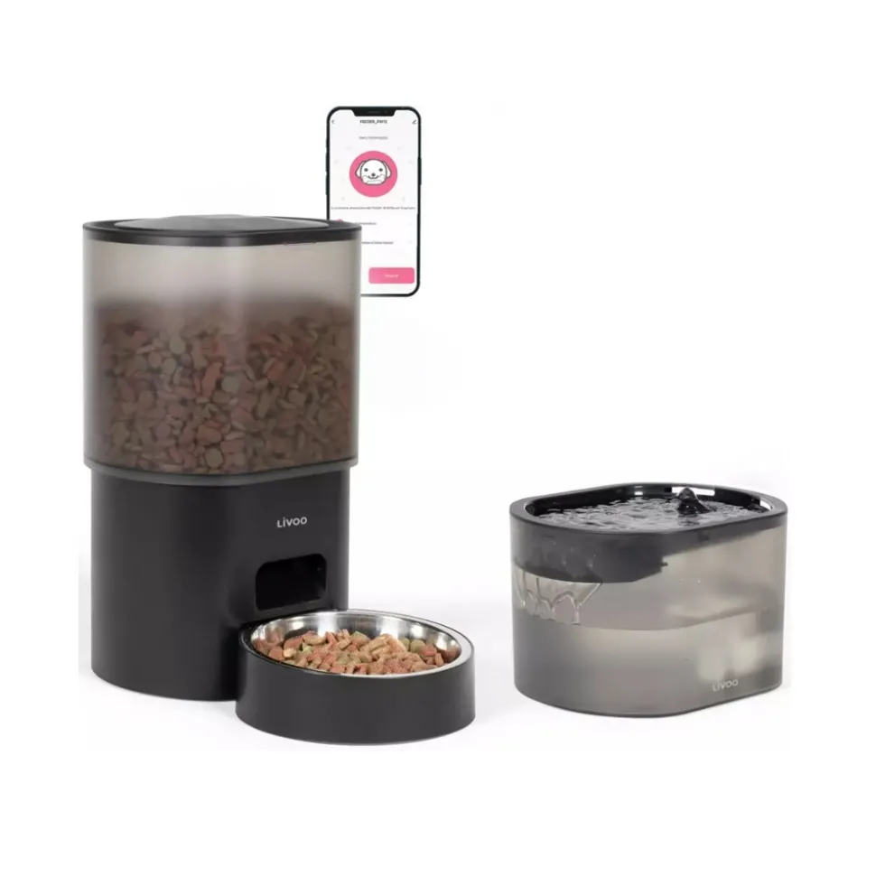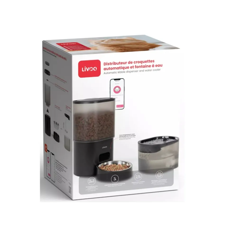 Set 2 en 1, idéal pour hydrater et nourrir les animaux même à distance en programmant jusqu’à 10 repas par jour sur le distributeur, avec possibilité de diffuser un message vocal lors de chaque distribution.