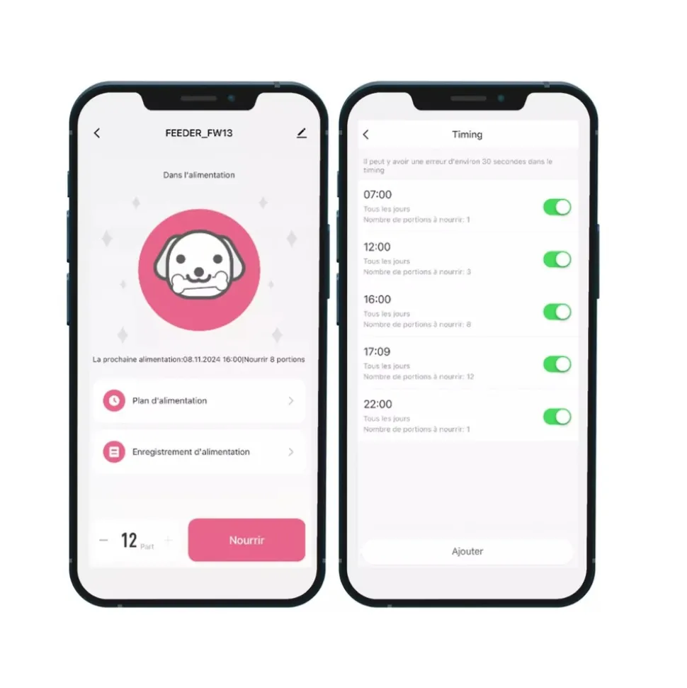 Type de programmes(s) : Horaires et quantités programmables avec journal de bord jusqu’à 10 repas par jour / 12 portions par repas (8 à 12 g par portion).