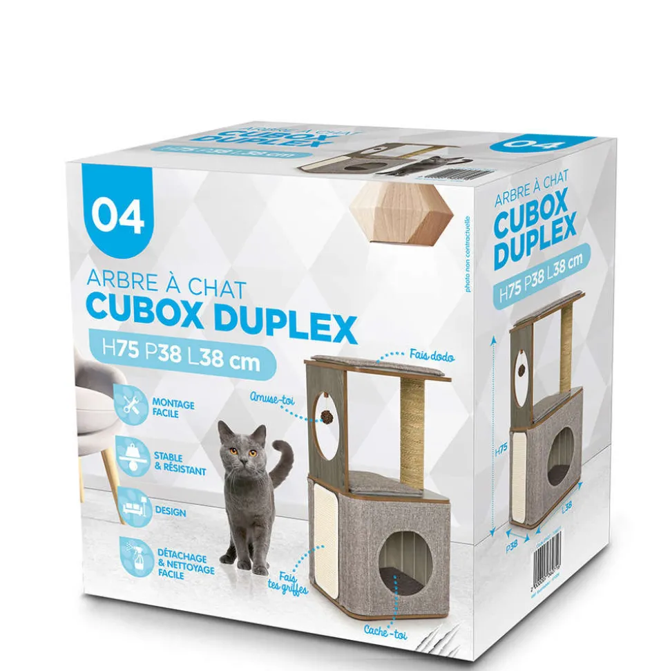 L’arbre à chats Cubox duplex est une aire de jeux et de repos qui offrira à votre petit félin un espace personnel des plus confortables grâce à sa matière en peluche. Il saura répondre aux besoins de votre chat en matière d’amusement et il sera un véritable lieu d’observation de son environnement. L’arbre à chat est essentiel et détournera l’envie de votre félin de frotter ses griffes sur les meubles et autres objets. Pratique, cet arbre s’entretient facilement à l’eau savonneuse.