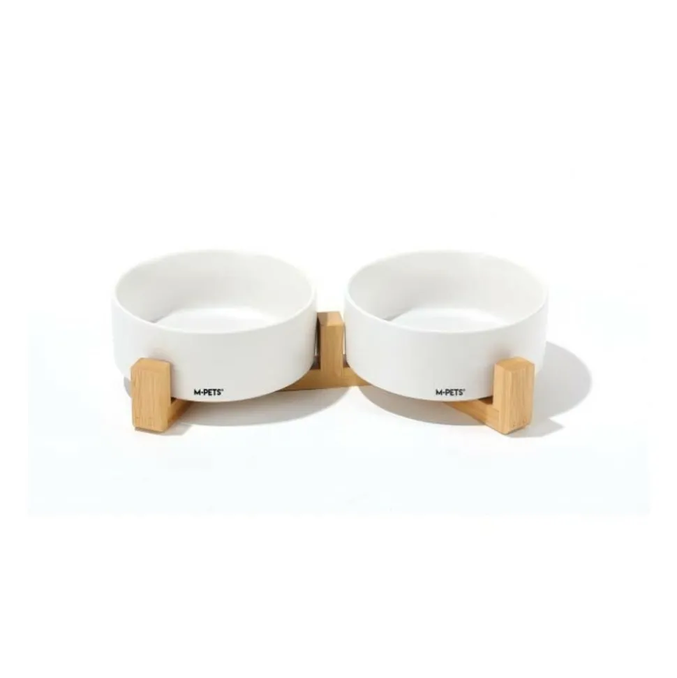 Gamelle design avec double bol en céramique et support en bambou. Lavable au lave-vaisselle et pied antidérapant.
