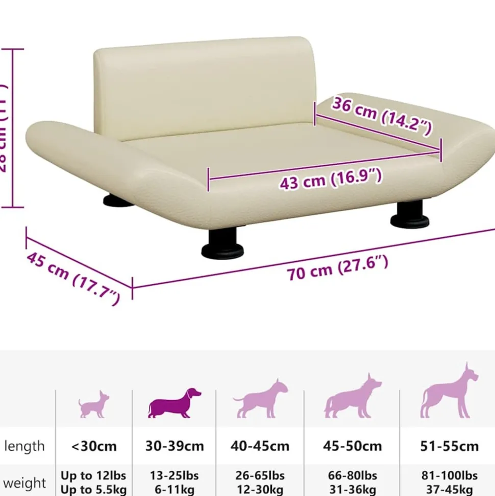 Offrez à votre ami à fourrure un endroit chaud et confortable pour se détendre avec ce lit pour chiens ! Matériau confortable et doux : le canapé pour animaux de compagnie est rembourré de mousse épaisse et douce et recouvert de similicuir, offrant un soutien suffisant et un confort supérieur pour que votre adorable animal de compagnie puisse s’y reposer.Cadre robuste et durable : le cadre en bois de pin massif assure la robustesse et la durabilité du canapé pour chien. Les quatre pieds ajoutent également une stabilité supplémentaire.Nettoyage facile : le revêtement en similicuir de ce canapé pour chien est imperméable, résistant à la saleté et facile à essuyer et à nettoyer.Design élégant : ce canapé pour chien s’adapte parfaitement à tous les thèmes de décoration et constitue un excellent complément à votre salon ou à votre chambre à coucher. Remarque :Veuillez mesurer la longueur du corps de votre animal de compagnie avant d’acheter.