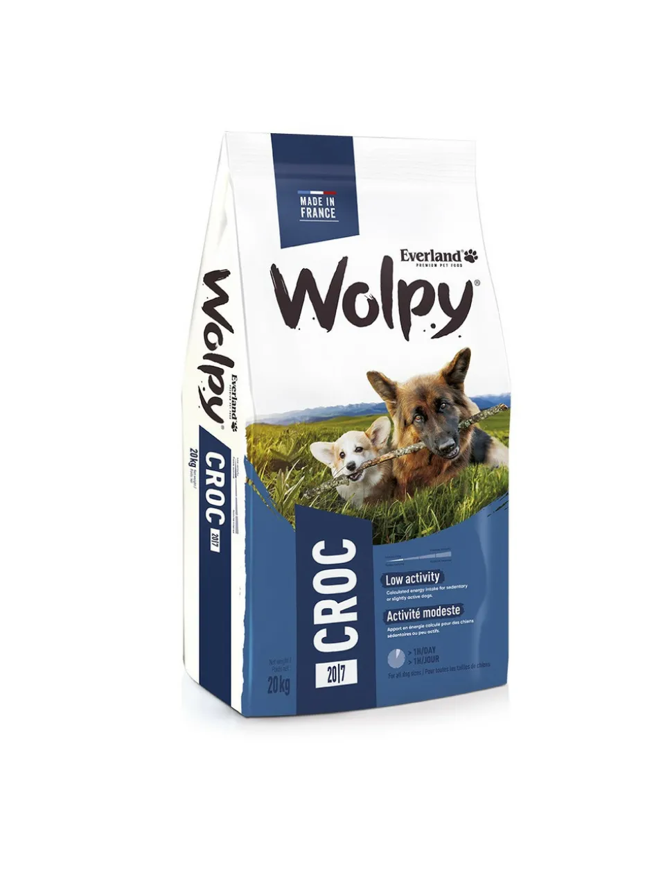 WOLPY Croc est un aliment formulé pour répondre aux attentes techniques et économiques des propriétaires de chiens de chasse ou de travail ayant une activité modérée.