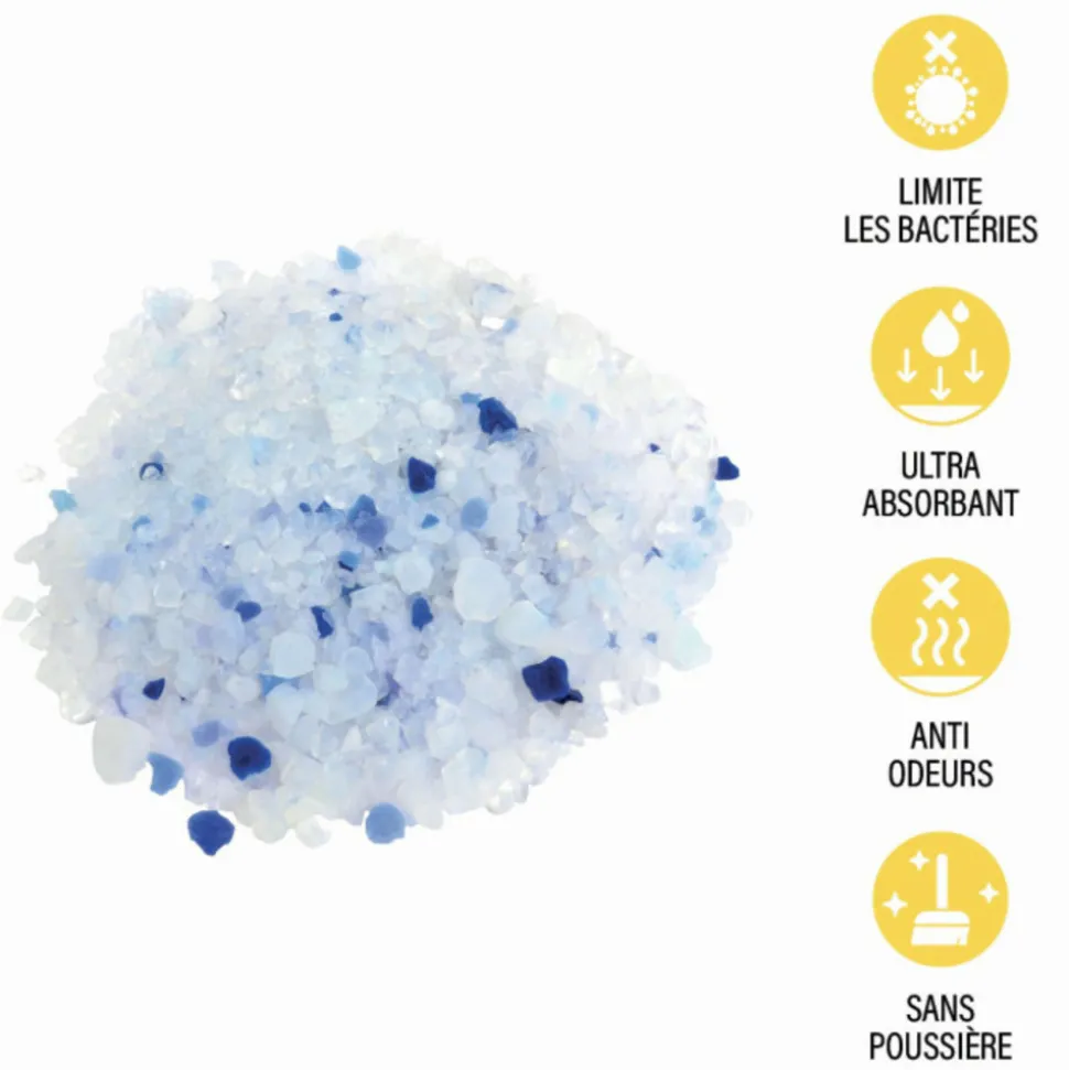 Matière : Cristaux de SiliceSpécificités :Anti-odeurs & Ultra-absorbanteLitière pour chatSilice minéraleLimite les bactériesSans poussièresCapacité : 3,8 LPoids : 1,6 kgCouleur : Bleu