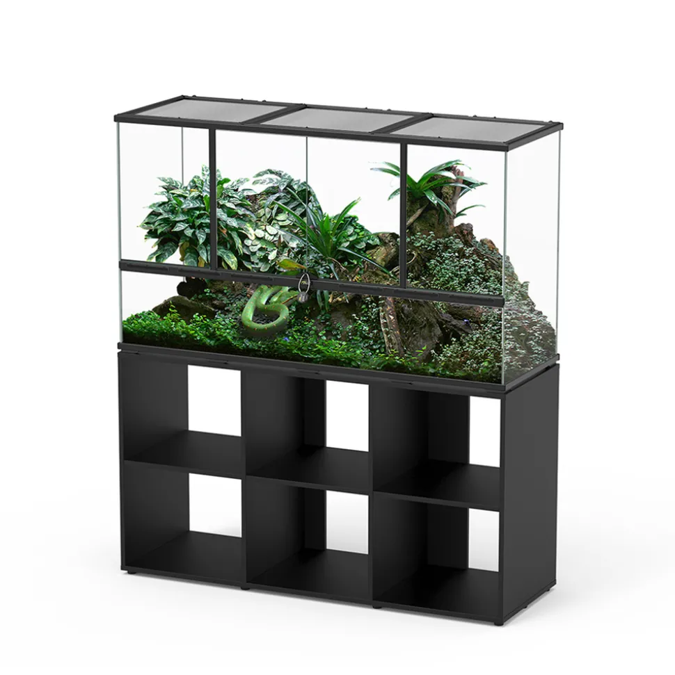 Nouvelle tendance déco, la terrariophilie élargit son cercle d’amateurs et s’invite désormais à la maison en donnant l’occasion à chacun de reconstituer un petit morceau de nature au cœur de son chez soi. Les amphibiens et les reptiles apprécieront le confort et l’espace disponible dans ce terrarium possédant toutes les qualités nécessaires à leurs besoins physiologiques. Véritable élément de décoration aux lignes épurées, ce terrarium en verre et à la structure en aluminium de haute qualité s’intègre aisément dans tous les types d’intérieurs pour devenir le point de mire d’un espace nature zen et authentique. Le meuble accompagnant votre terrarium est doté de nombreuses étagères sur lesquelles vous pourrez disposer vos objets favoris utiles ou décoratifs. En choisissant ce terrarium, vous serez séduits par ses grilles amovibles de couverture. Elles en facilitent l’accès pour l’installer, le décorer et l’entretenir. Ces grilles sont aussi essentielles au bien-être de vos pensionnaires. Elles contribuent à assurer la bonne ventilation de leur milieu et la bonne diffusion de la lumière et des UV indispensables à leur santé. Pour sécuriser vos animaux, votre terrarium est également équipé d’un cadenas à ouverture par code personnalisable. Il est proposé en différents coloris. Ensemble Terrarium et Meuble Standard Noir L.132xP.45xH.75cm.