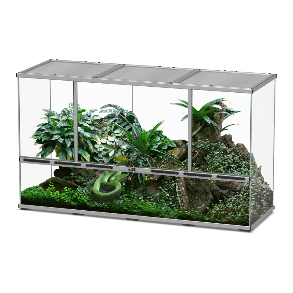 Nouvelle tendance déco, la terrariophilie élargit son cercle d’amateurs et s’invite désormais à la maison en donnant l’occasion à chacun de reconstituer un petit morceau de nature au cœur de son chez soi. Les amphibiens et les reptiles apprécieront le confort et l’espace disponible dans ce terrarium possédant toutes les qualités nécessaires à leurs besoins physiologiques. Véritable élément de décoration aux lignes épurées, ce terrarium en verre et à la structure en aluminium de haute qualité s’intègre aisément dans tous les types d’intérieurs pour devenir le point de mire d’un espace nature zen et authentique. En choisissant ce terrarium, vous serez séduits par ses grilles amovibles de couverture. Elles en facilitent l’accès pour l’installer, le décorer et l’entretenir. Ces grilles sont aussi essentielles au bien-être de vos pensionnaires. Elles contribuent à assurer la bonne ventilation de leur milieu et la bonne diffusion de la lumière et des UV indispensables à leur santé. Pour sécuriser vos animaux, votre terrarium est également équipé d’un cadenas à ouverture par code personnalisable. Il est proposé en différents coloris. Terrarium Gris L.132xP.45xH.75cm.