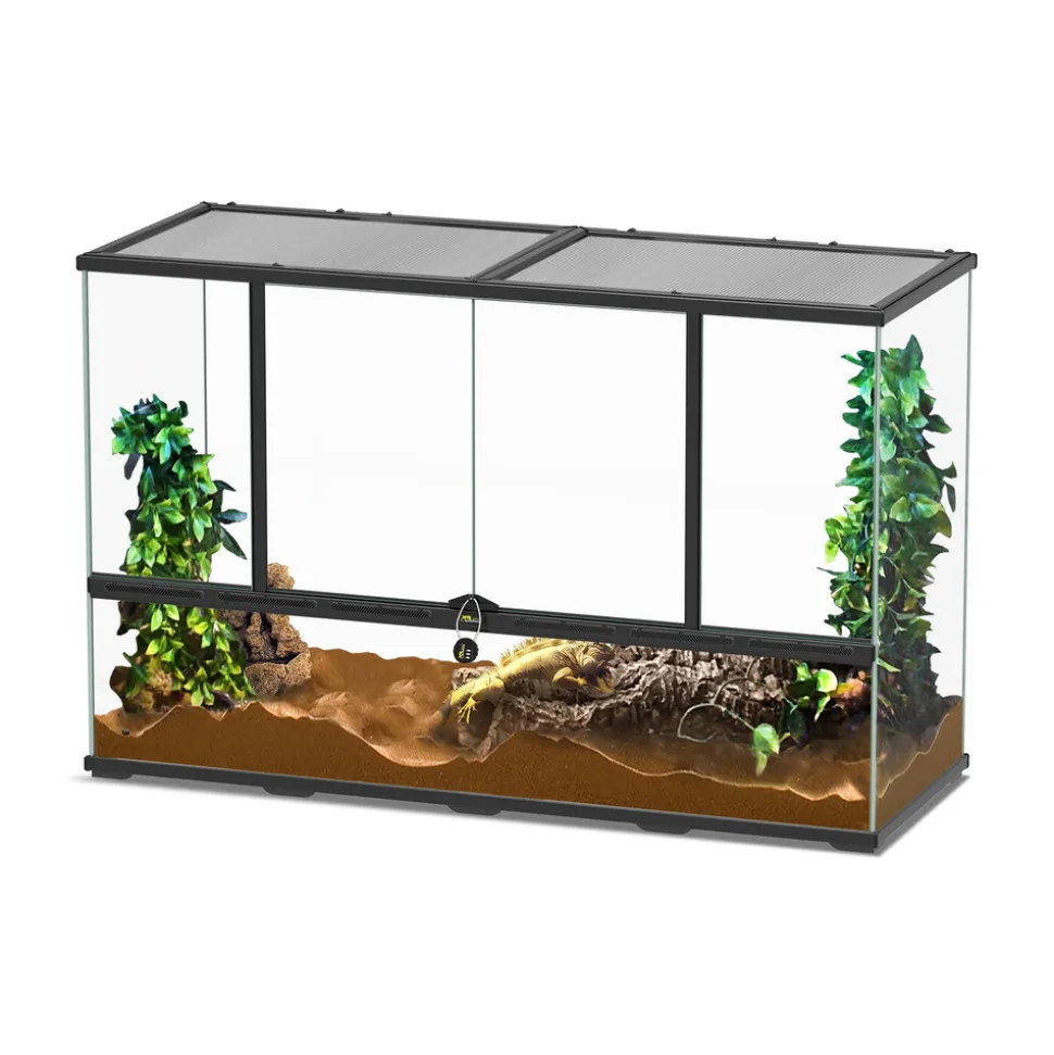 Nouvelle tendance déco, la terrariophilie élargit son cercle d’amateurs et s’invite désormais à la maison en donnant l’occasion à chacun de reconstituer un petit morceau de nature au cœur de son chez soi. Les amphibiens et les reptiles apprécieront le confort et l’espace disponible dans ce terrarium possédant toutes les qualités nécessaires à leurs besoins physiologiques. Véritable élément de décoration aux lignes épurées, ce terrarium en verre et à la structure en aluminium de haute qualité s’intègre aisément dans tous les types d’intérieurs pour devenir le point de mire d’un espace nature zen et authentique. En choisissant ce terrarium, vous serez séduits par ses grilles amovibles de couverture. Elles en facilitent l’accès pour l’installer, le décorer et l’entretenir. Ces grilles sont aussi essentielles au bien-être de vos pensionnaires. Elles contribuent à assurer la bonne ventilation de leur milieu et la bonne diffusion de la lumière et des UV indispensables à leur santé. Pour sécuriser vos animaux, votre terrarium est également équipé d’un cadenas à ouverture par code personnalisable. Il est proposé en différents coloris. Terrarium Noir L.118xP.45xH.75cm