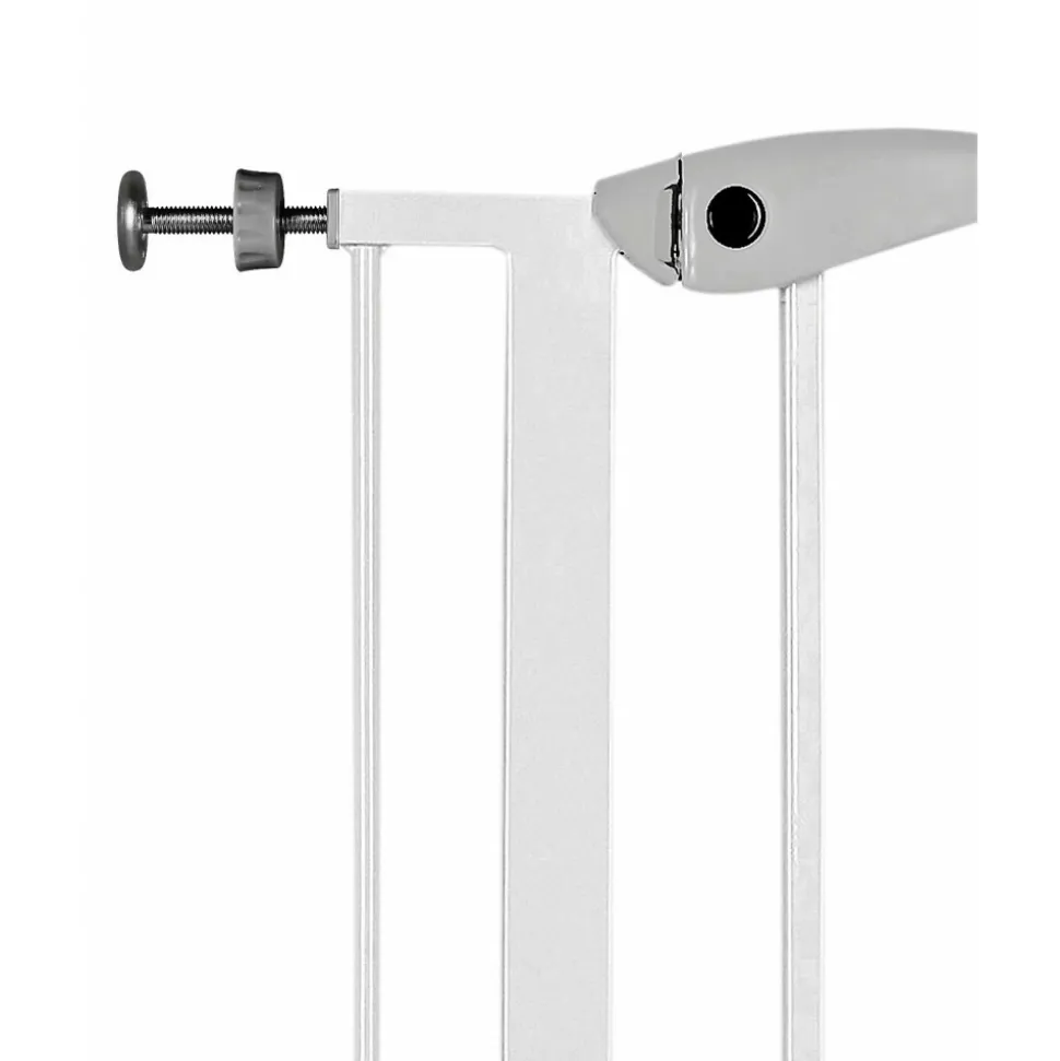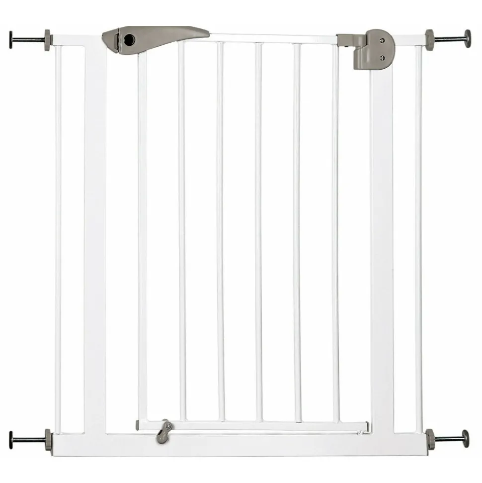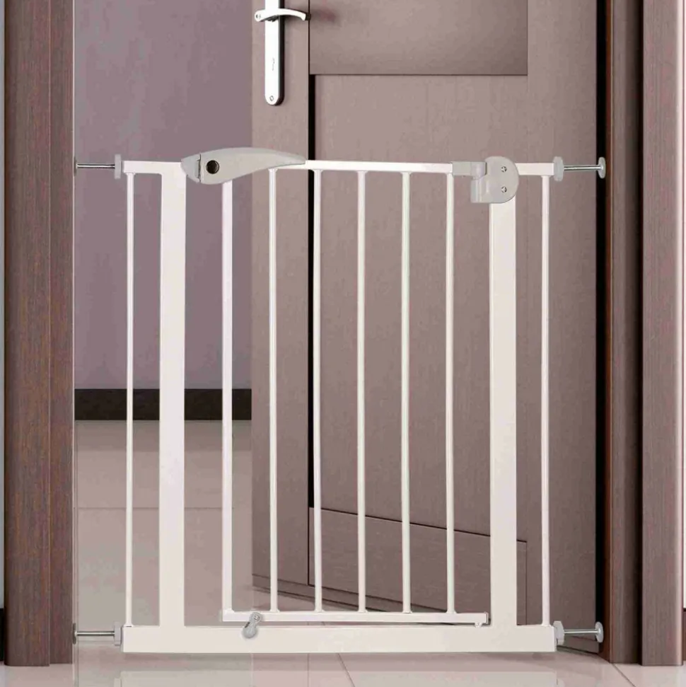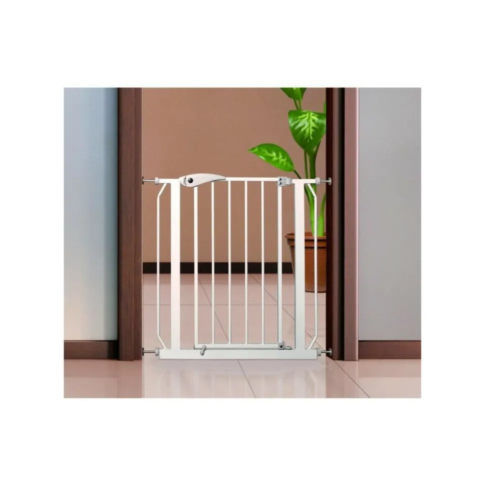 Barrière pour chiens. dimension: de 75 à 85 cm de largeur × 76 cm Hauteur.couleur blanc. convient aussi aux grands chiens. en métal, verni. fixation facile avec 4 systèmes de serrage (sans vis, sans perçage).porte en métal à charnière, s’ouvre des deux côtés.verrouillage sécurisé, peut s’ouvrir et se fermer d’une seule main.