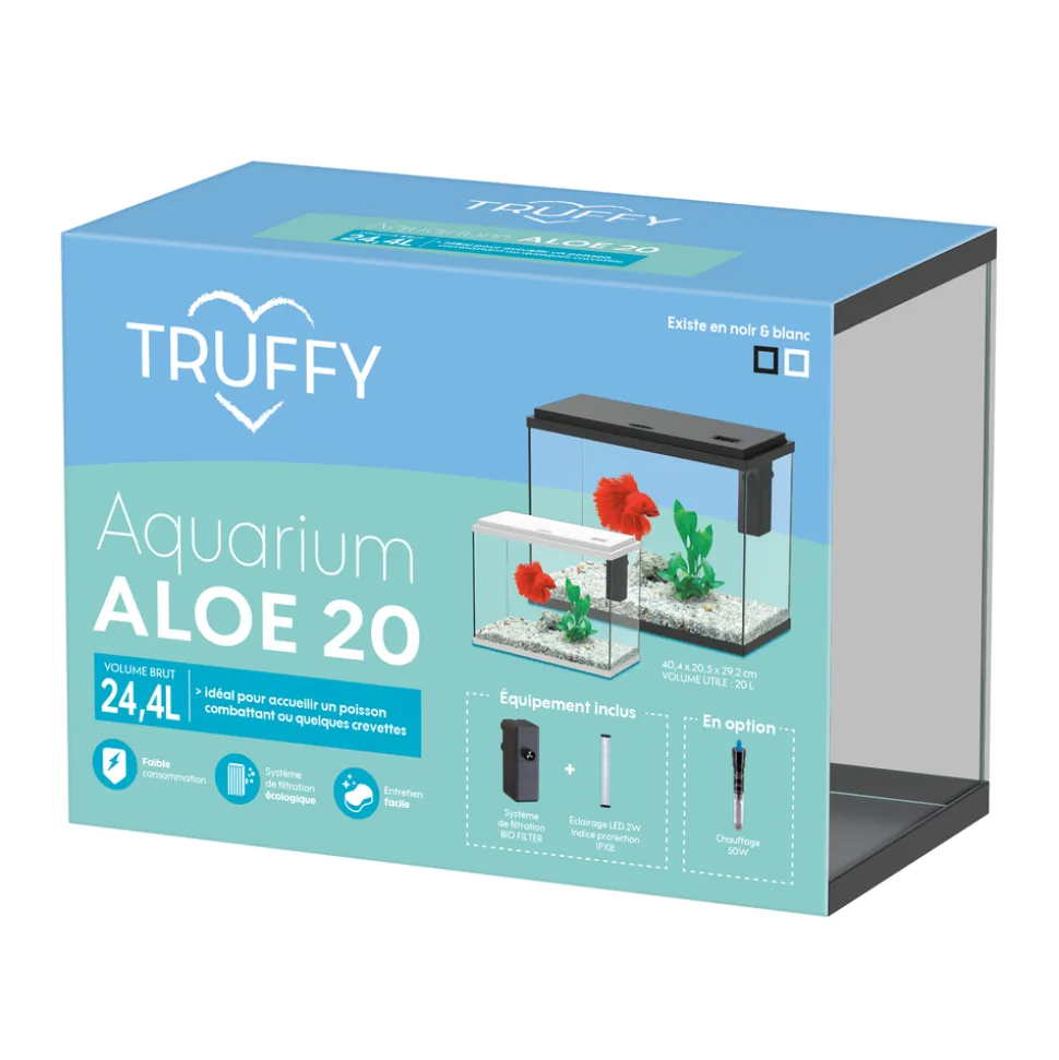 En vous lançant dans l’aquariophilie, vous aurez le bonheur de faire entrer la nature chez vous. Vous découvrirez ainsi la richesse que nous offre le monde aquatique. L’aquarium ALOE est l’aquarium idéal pour initier vos enfants à l’aquariophilie. Son volume peu imposant et ses matériaux robustes (couvercle en plastique) sont adaptés au maniement parfois moins délicat de nos chers apprentis aquariophiles. D’une capacité de 24 L, votre aquarium accueillera confortablement vos poissons. Il est équipé d’un système de filtration Bio Filter 200 doté des nouvelles cartouches B-Box conçues à partir d’un revêtement non polluant sans plastique qui peut être éliminé par compostage. Son éclairage LED indispensable pour la croissance des plantes aquatique est peu consommateur d’énergies. Laissez vous séduire par cet aquarium compact respectueux de notre environnement ! Il n’a pas fini de vous surprendre. Aquarium ALOE LED équipé noir 24 litres – L.40,4xP.20,5xH.29,2cm – Volume utile 20 litres.