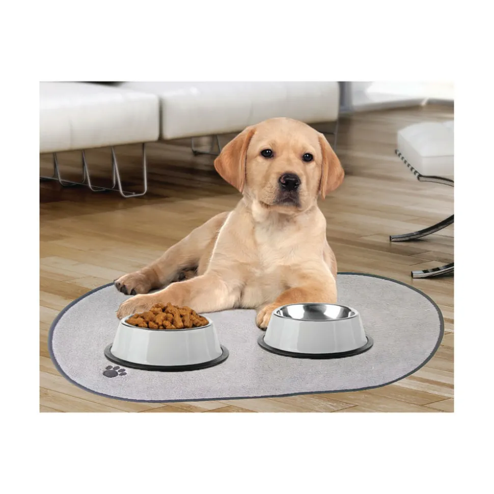 Le tapis microfibre d’alimentation pour animaux de compagnie chats et/ou chiens empêche tous débordements des gamelles de vos animaux grâce à son système anti-dérapant. De plus, il est conçu pour sécher et absorber rapidement, afin de garantir des sols toujours secs près de la nourriture de vos animaux. Existe en gris et en noir, envoyé selon nos stocks disponibles.