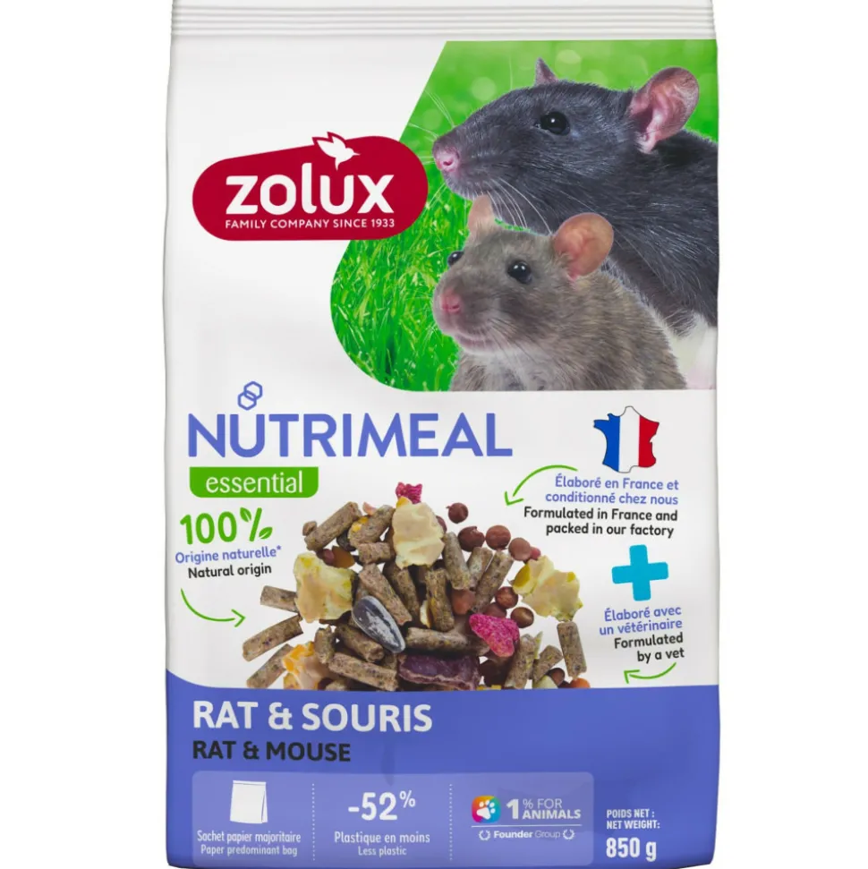 Aliment composé pour rat et souris Nutrimeal sachet de 850 grecette améliorée adaptée aux besoins de l’espèceTaux de matières grasses adapté (tournesol) : Besoin de plus de matières grasses qu’un herbivorePois et lentilles : Source de protéines végétaleFormule : Granulés 40%, flocons, lentilles, extrudés, caroube, tournesolMODE D’EMPLOI : Mettre à disposition quotidiennement en quantité suffisante. Renouveler le contenu de la mangeoire chaque jour. Tenir à disposition permanente de l’eau propre et fraîche.sachet de 850 gAliment composé pour rat et souris Nutrimeal sachet de 850 grecette améliorée adaptée aux besoins de l’espèceTaux de matières grasses adapté (tournesol) : Besoin de plus de matières grasses qu’un herbivorePois et lentilles : Source de protéines végétaleFormule : Granulés 40%, flocons, lentilles, extrudés, caroube, tournesolMODE D’EMPLOI : Mettre à disposition quotidiennement en quantité suffisante. Renouveler le contenu de la mangeoire chaque jour. Tenir à disposition permanente de l’eau propre et fraîche.sachet de 850 gélaborée en France avec un vétérinaireconditionnée dans notre usine de fabrication à Péronnecomposée à 100% de matières 1ères d’origine naturellenouvelle sacherie (PAPIER/PE) + épaisse, meilleure résistance à l’humidité.Produit porteur du Label 1% Pour Les AnimauxFormule : Granulés 40%, flocons, lentilles, extrudés, caroube, tournesolComposition : Sous produits d’origine végétale, légumes, céréales, substances minérales, huiles et graisses.Additifs/kg : Vitamines : Vitamine A : 4788,00 ui, Vitamine D3 : 531,87 ui, Vitamine E : 23,94 ui , Oligo-éléments : Manganèse – Oxyde de manganèse (II) : 6,10 mg, Fer-Sulfate de Fer(