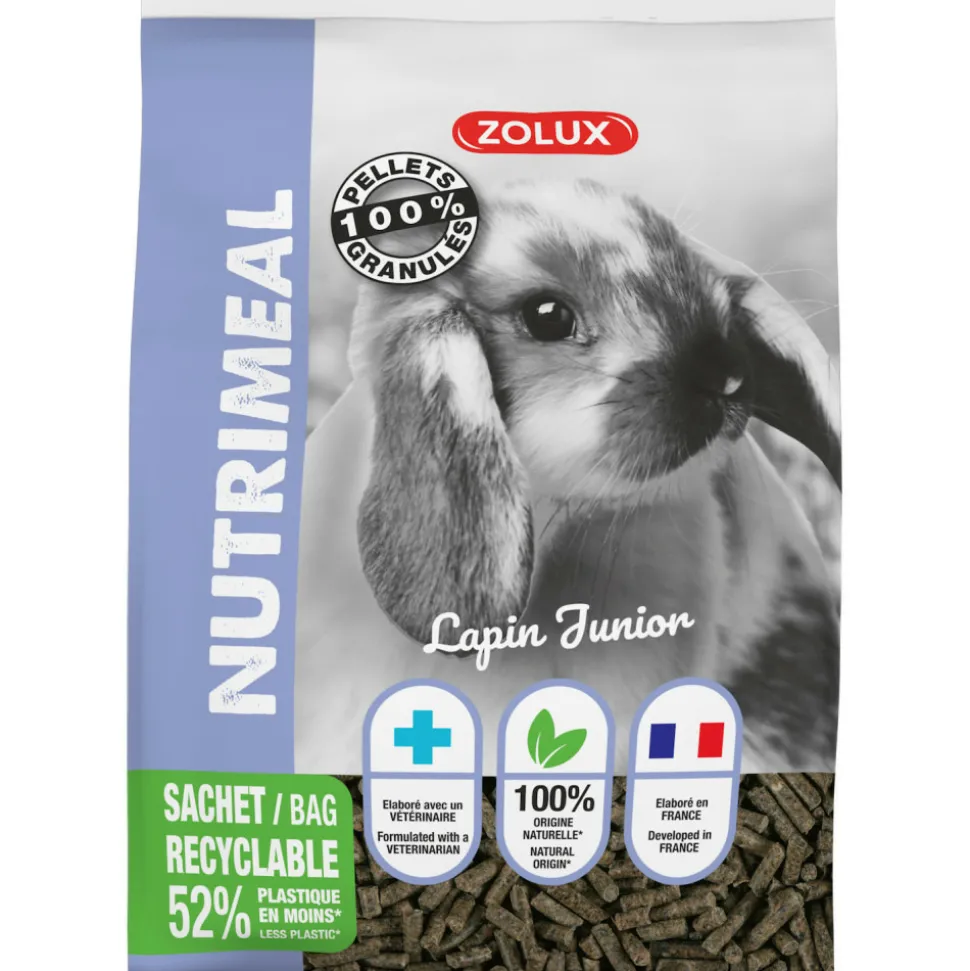 Granulés pour lapin nain junior (moins de 6 mois). Elaborée en France.Composée à 100% de matières 1ères d’origine naturelle.Sans colorant, sans conservateur.Nouvelle recette adaptée aux lapins nain junior (moins de 6 mois).100% granulés : évite le tri, favorise l’équilibre alimentaire et la régulation dentaire.Riche en fibre : favorise le transit.Teneur en calcium adaptée : aide à la croissance et évite les problèmes de calculs rénaux.Granulés pour lapin nain junior (moins de 6 mois). Elaborée en France. Conditionnée à Péronne (80 Somme).Composée à 100% de matières 1ères d’origine naturelle.Sans colorant, sans conservateur.Nouvelle recette adaptée aux lapins nain junior (moins de 6 mois).100% granulés : évite le tri, favorise l’équilibre alimentaire et la régulation dentaire.Riche en fibre : favorise le transit.Teneur en calcium adaptée : aide à la croissance et évite les problèmes de calculs rénaux.Composition : Granulés 100%. sous produits d’origine végétale, légumes, céréales, substances minérales, huiles et graisses.Constituants analytiques :Cellulose 15,90%, Protéines 16,50% , Cendres brutes 7,10%, Matières grasses 2,30%, Calcium 1,08%, Phosphore 0,58%, Sodium 0,25%.Nouvelle sacherie 100% recyclable, constituée de 51% de papier minimum.