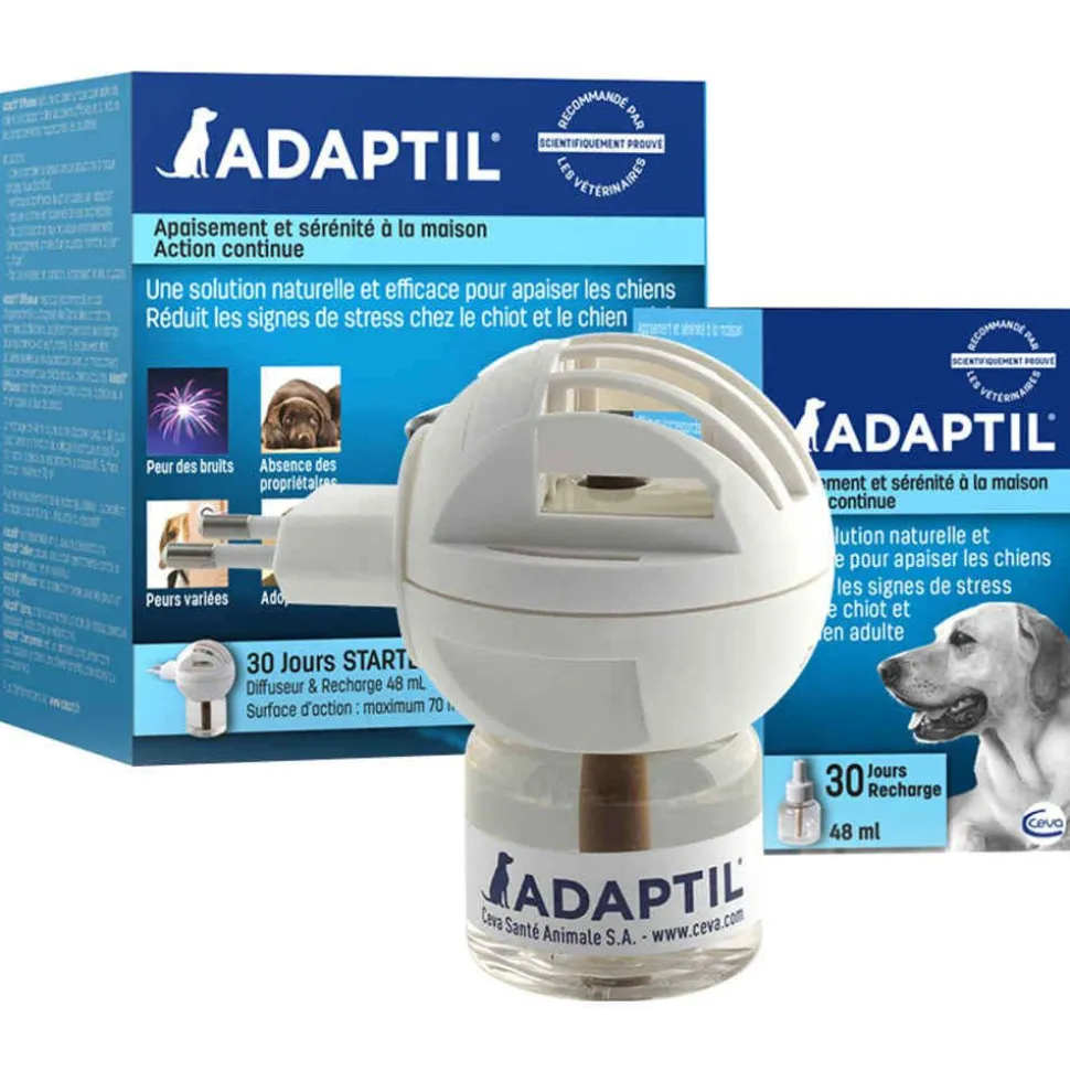 Adaptil est une solution développée afin d’aider le chien à surmonter les situations difficiles auxquelles il peut être confronté durant sa vie, comme la première nuit passée par loin de la mère.