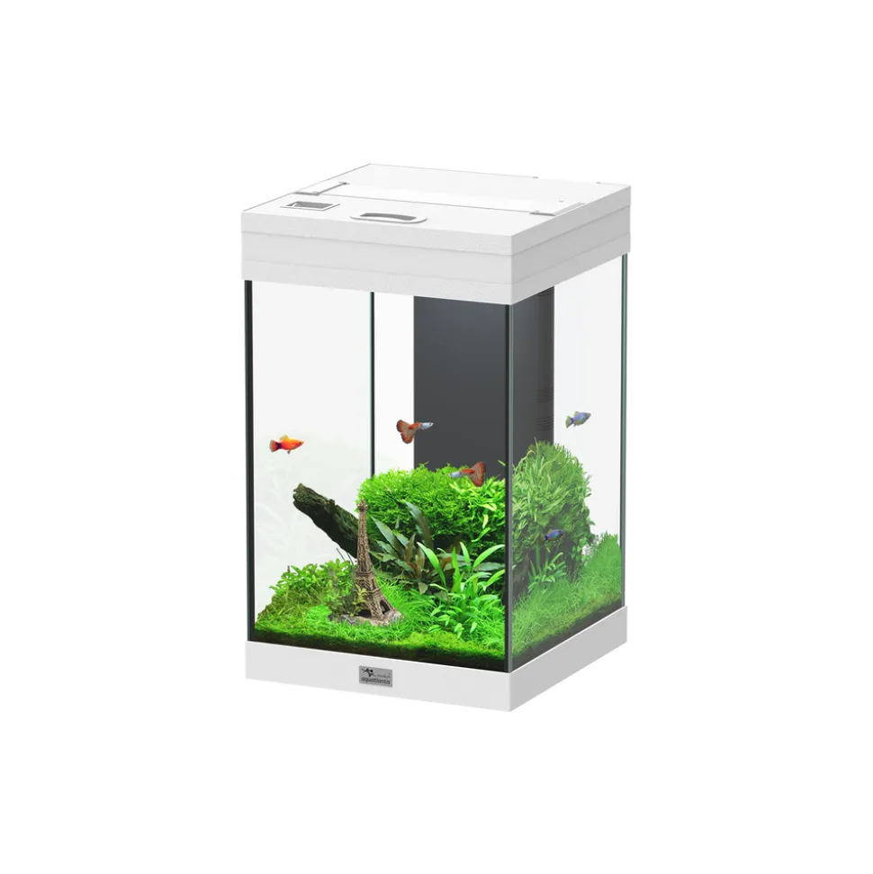 Un bel aquarium, n’est-ce pas l’atout charme d’une déco d’exception qui transporte un petit morceau de nature dans votre intérieur ? L’aquarium Aqua Tower est idéal pour démarrer l’aquariophilie. Esthétique, grâce à sa forme en colonne, il trouvera facilement sa place dans votre intérieur. Disposant d’un volume brut de 43 litres, cet aquarium met à votre disposition environ 35 litres d’eau de volume utile pour exprimer votre créativité. Vous pourrez créer un magnifique paysage aquatique pour que vos poissons évoluent parmi des roches, racines et massifs végétaux luxuriants. Riche en couleurs, votre aquarium animera votre salon tel un véritable tableau vivant ! L’aquarium en colonne Tower est équipé d’un filtre intérieur MiniBiobox et d’un chauffage Easyklim 50 avec thermostat ajustable. Vous pourrez ainsi associer entre 5 et 10 poissons de petite taille pour peupler harmonieusement votre nouveau milieu aquatique. L’éclairage Led de haute qualité à basse consommation d’énergie qui équipe cet aquarium fournit une lumière naturelle en couvrant un spectre très proche de celui du soleil. Les plantes aquatiques bénéficiant ainsi d’excellentes conditions de croissance, vous pourrez en associer différentes variétés de différentes formes et couleurs, y compris parmi les plus exigeantes. Aquarium Aqua Tower Equipé Blanc L.30xP.30xH.49 cm.