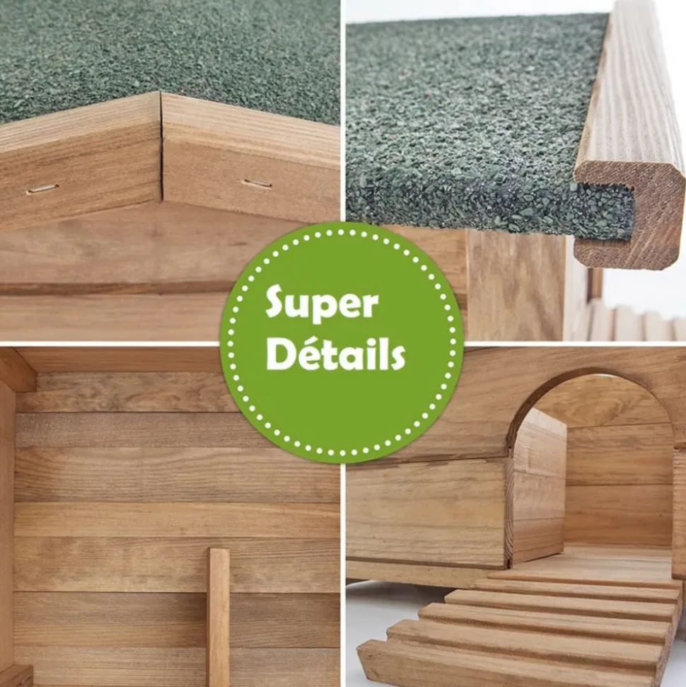 Le bois est un matériau naturel, si l’emplacement de l’enclos et son entretien ne sont pas adaptés, la durée de vie de l’enclos sera moins longue.Les lapins peuvent tout grignoter, les dents veulent être éraflées. Nous vous conseillons de leur offrir des