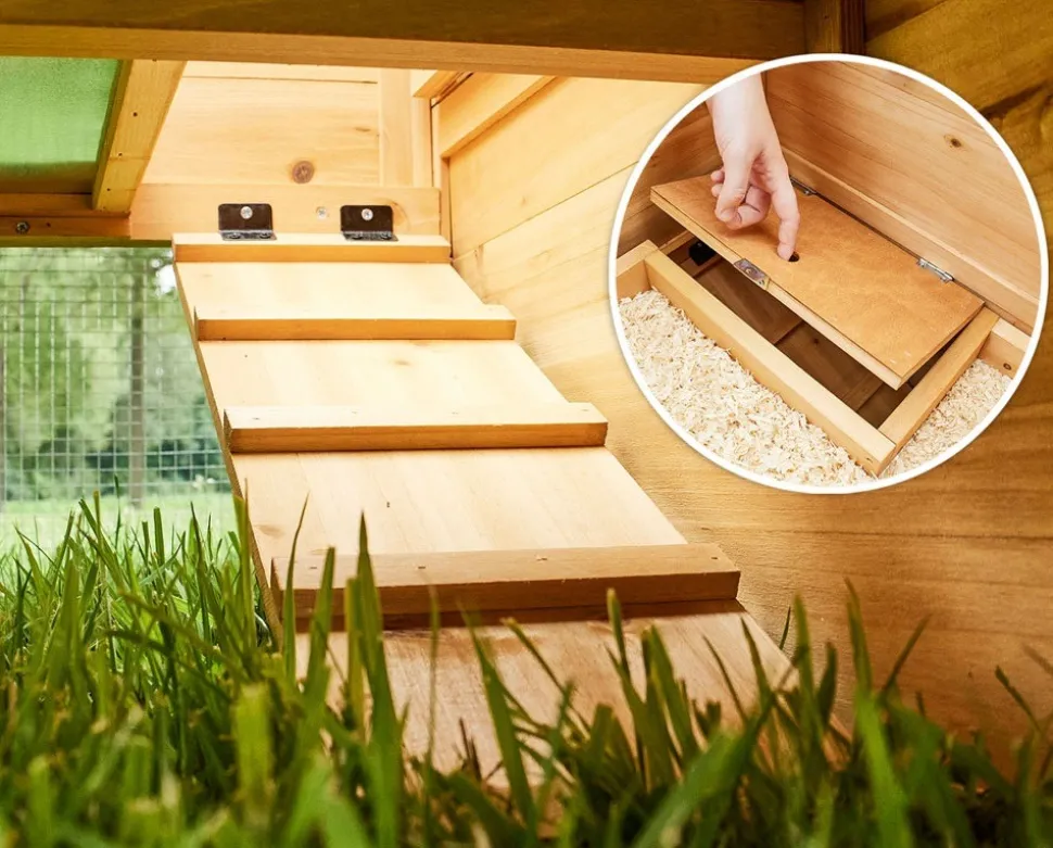 dans la zone inférieure, il y a une zone de course libre continue sur l’herbe. 4 portes vous permettent d’accéder facilement à tous les coins. Les animaux ont ici beaucoup d’espace pour se défouler et grignoter l’herbe. Les rongeurs peuvent sauter dans la zone stable via une rampe. L’escalier peut être fermé avec un volet et vous avez alors deux étages séparés.