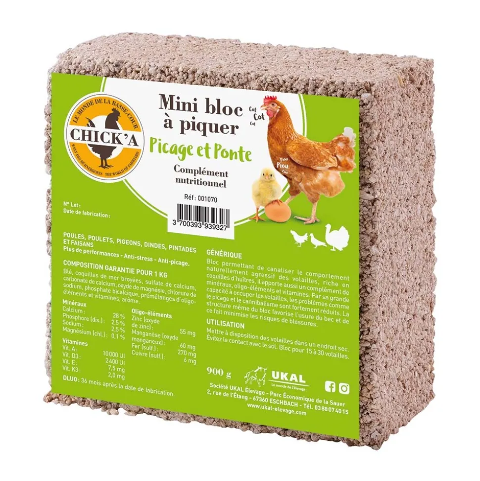 Bloc permettant de canaliser le comportement naturellement agressif des volailles, riche en coquilles d’huîtres, il apporte aussi un complément de minéraux, oligo-éléments et vitamines. Par sa grande capacité à occuper les volailles, les problèmes comme le picage et le cannibalisme sont fortement réduits. La structure même du bloc favorise l’usure du bec et de ce fait minimise les risques de blessures. Mettre à disposition des volailles dans un endroit sec. Évitez le contact avec le sol. Bloc pour 15 à 30 volailles. Pour poules, poulets, pigeons, dindes, pintades et faisans.Plus de performances – Anti-stress – Anti-picage. Poids : 900 gCompositionBlé, coquilles de mer broyées, sulfate de calcium, carbonate de calcium, oxyde de magnésie, chlorure de sodium, phosphate bicalcique, prémélanges d’oligoéléments et vitamines, arôme. Minéraux : Calcium : 28 %, Phosphore (dis.) : 2,5 %, Sodium : 2,5 %, Magnésium (chl.) : 0,1 %, Vitamines : Vit. A : 10 000 UI, Vit. D3 : 2 400 UI, Vit. E : 7,5 mg, Vit. K3 : 2,0 mg Oligo-éléments : Zinc (oxyde de zinc) : 55 mg, Manganèse (oxyde manganeux) : 60 mg, Fer (sulf.) : 270 mg, Cuivre (sulf.) : 6 mg DLUO : 36 mois après la date de fabrication. Disponible uniquement pour la France et la Belgique.