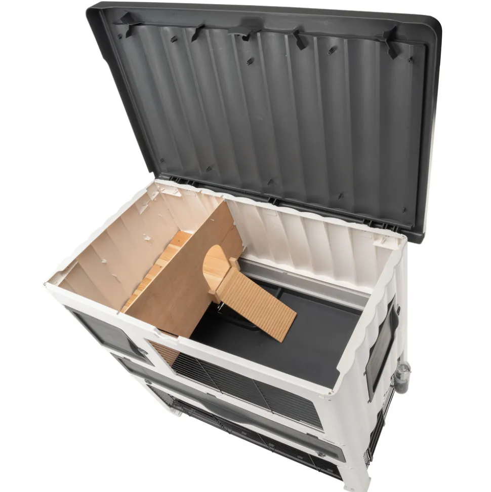 Le clapier Grand Lodge vous permet d’effectuer les opérations d’entretien quotidien en tout confort grâce au toit à charnières à ouverture totale et aux deux grands tiroirs de récupération des saletés amovibles. L’habitat dispose également d’une porte latérale utile avec serrure de sécurité.