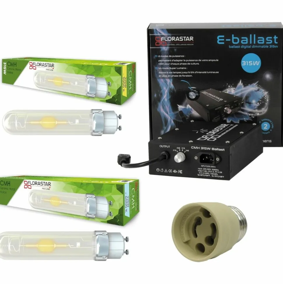 Le E-ballast 315W Florastar inclus dans ce kit est prévu pour faire fonctionner uniquement les ampoules CMH (Céramic Métal Halide). Il dispose d’un swtich 210-240-315W et d’une fonction super lumens 340W qui vous permettrons d’adapter la puissance de vos ampoules CMH en fonction des phases de développement de vos cultures.