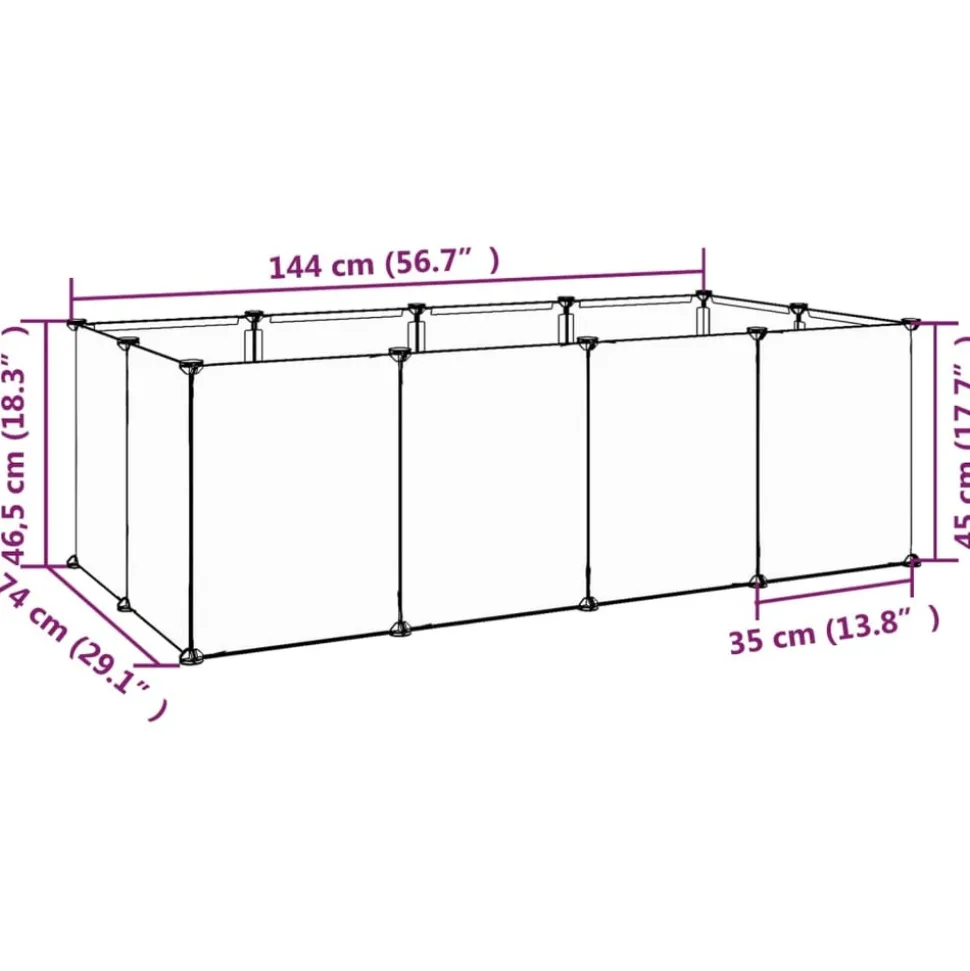 Cette cage pour petits animaux offre un espace clos spacieux et sécuritaire pour que vos animaux de compagnie puissent jouer et se reposer. Matériau pratique : la cage pour animaux est fabriquée à partir de panneaux en plastique PP, qui sont résistants à l’eau et nécessitent peu d’entretien. Structure solide et stable : les cadres en acier garantissent la solidité et la stabilité. Cage spacieuse : le clapier pour animaux de compagnie dispose d’un espace suffisant pour que vos petits amis à quatre pattes puissent se reposer et jouer tout en restant en sécurité dans les limites. Design convivial : la cage pour animaux de compagnie peut être assemblée facilement avec le marteau en bois inclus. Lorsqu’elle n’est pas utilisée, il est facile de séparer les panneaux et de les empiler pour économiser de l’espace. Convient aux petits animaux : cette clôture pour animaux de compagnie offre un excellent terrain de jeu pour les petits animaux comme les chiots, les chatons, les lapins, les hérissons, les hamsters, les cochons d’Inde, etc. Couleur : transparent Matériau : PP (Polypropylène), acier Dimensions totales : 144 x 74 x 46,5 cm (L x l x H) Dimensions de chaque panneau (L) : 45 x 35 cm (L x l) Dimensions de chaque panneau (S) : 35 x 35 cm (L x l) L’assemblage est requis La livraison contient : 12 x panneau (L) 8 x panneau (S) 29 x connecteur 17 x tapis rond antidérapant 30 x attache noire en plastique 1 x marteau à bois 1 x manuel d’instructions