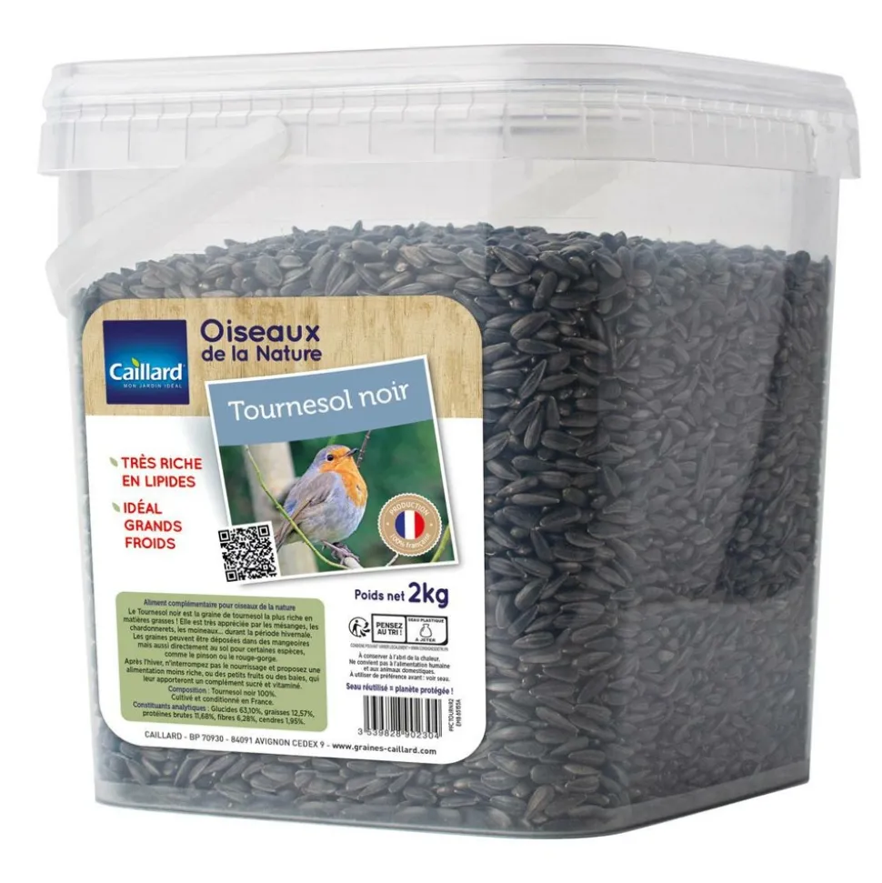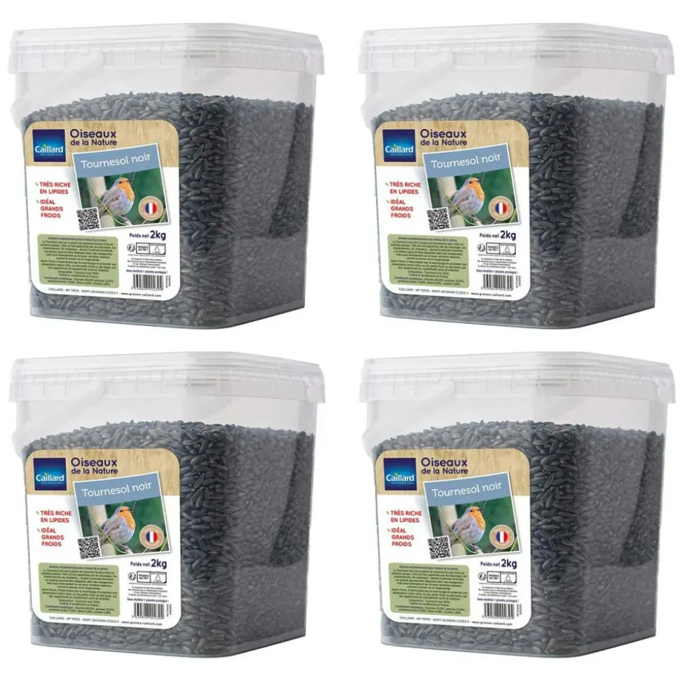 L’arrivée de l’hiver apporte son lot de défis pour nos amis ailés. Dans cet esprit, notre nouveau pack de quatre seaux de graines de tournesol noir de 2 kgs est une aubaine pour les oiseaux sauvages. Ces graines, un trésor nutritionnel, sont un soutien vital pour les oiseaux durant les mois froids.Nutrition Optimale pour les OiseauxCes graines de tournesol noir, soigneusement conditionnées en France, se distinguent par leur haute teneur en matières grasses, essentielle pour fournir l’énergie nécessaire aux oiseaux tels que les chardonnerets, les mésanges et les moineaux en période hivernale.Usage Pratique et SécuritaireLe pack comprend quatre seaux de 2 000 grammes chacun, conçus pour une utilisation aisée. Pour protéger les oiseaux des prédateurs comme les chats, nous recommandons de placer ces graines dans des mangeoires élevées plutôt que de les répandre au sol.Pureté et Qualité GarantiesNous assurons une composition entièrement naturelle à base de tournesol noir pur, sans aucun additif. Cette qualité premium garantit une alimentation saine pour les oiseaux.Conseils d’Alimentation Post-HiverSelon les recommandations de Caillard, expert en alimentation aviaire, il est judicieux de continuer à nourrir les oiseaux après l’hiver, en introduisant des aliments plus légers comme des petits fruits ou des baies, riches en sucres et vitamines.ConclusionEn optant pour notre lot de quatre seaux de graines de tournesol noir, vous faites un choix responsable envers l’environnement et la faune aviaire. Ce geste bienveillant envers les oiseaux embellira votre espace extérieur et encouragera la biodiversité locale.