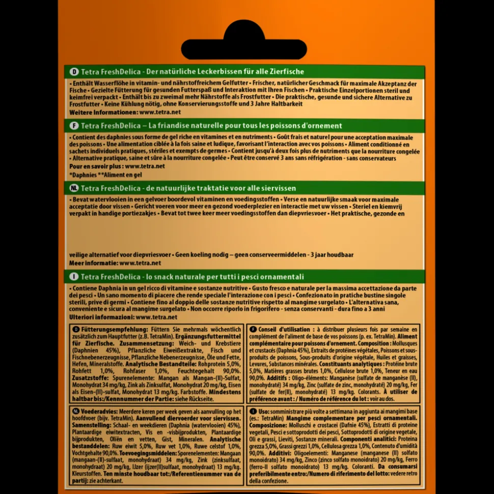 Friandises Daphnies » Daphnia » en gel 16 sticks de 3 g Fresh Delica nourriture pour Poissons d’ornementDélicieuse friandise qui contient des Daphnies entières en gelée riches en vitamines, oligo-éléments, et protéines.Ces friandises conviennent également aux poissons de mer.Offre un pouvoir nutritionnel 2 fois plus élevé que l’alimentation congelée!Conservation à température ambiante pendant 24 mois (et 24 heures au réfrigérateur après ouverture).Produit sans conservateur et qui ne trouble pas l’eau.Excellente appétence grâce au conditionnement en dosettes.Facile à doser.16 sticks de 3 g soit au total 48 gdimension 7cm x 9 hauteur 2.5 cmpoids du produit emballée : 70 gFriandises Daphnies » Daphnia » en gel 16 sticks de 3 g Fresh Delica nourriture pour Poissons d’ornementDélicieuse friandise qui contient des Daphnies entières en gelée riches en vitamines, oligo-éléments, et protéines.Ces friandises conviennent également aux poissons de mer.Offre un pouvoir nutritionnel 2 fois plus élevé que l’alimentation congelée!Conservation à température ambiante pendant 24 mois (et 24 heures au réfrigérateur après ouverture).Produit sans conservateur et qui ne trouble pas l’eau.Excellente appétence grâce au conditionnement en dosettes.Facile à doser.16 sticks de 3 g soit au total 48 gdimension 7cm x 9 hauteur 2.5 cmpoids du produit emballée : 70 gComposition : Mollusques et crustacés (Daphnia 45%), Extraits de protéines végétales, Poissons et sous-produits de poissons, Sous-produits d’origine végétale, Huiles et graisses, Levures, Substances minérales.Constituants analytiques : Protéine brute 5,0%, Matières grasses brutes 1,0%, Cellulose brute 1,0%,