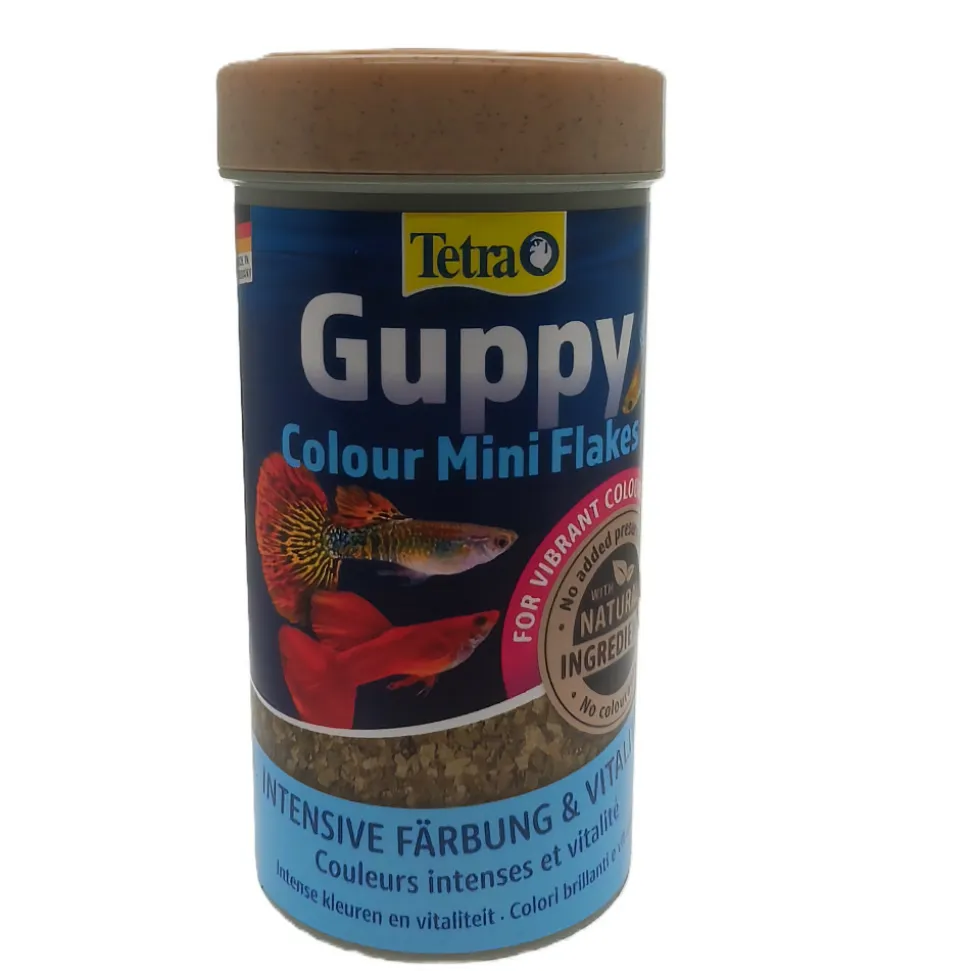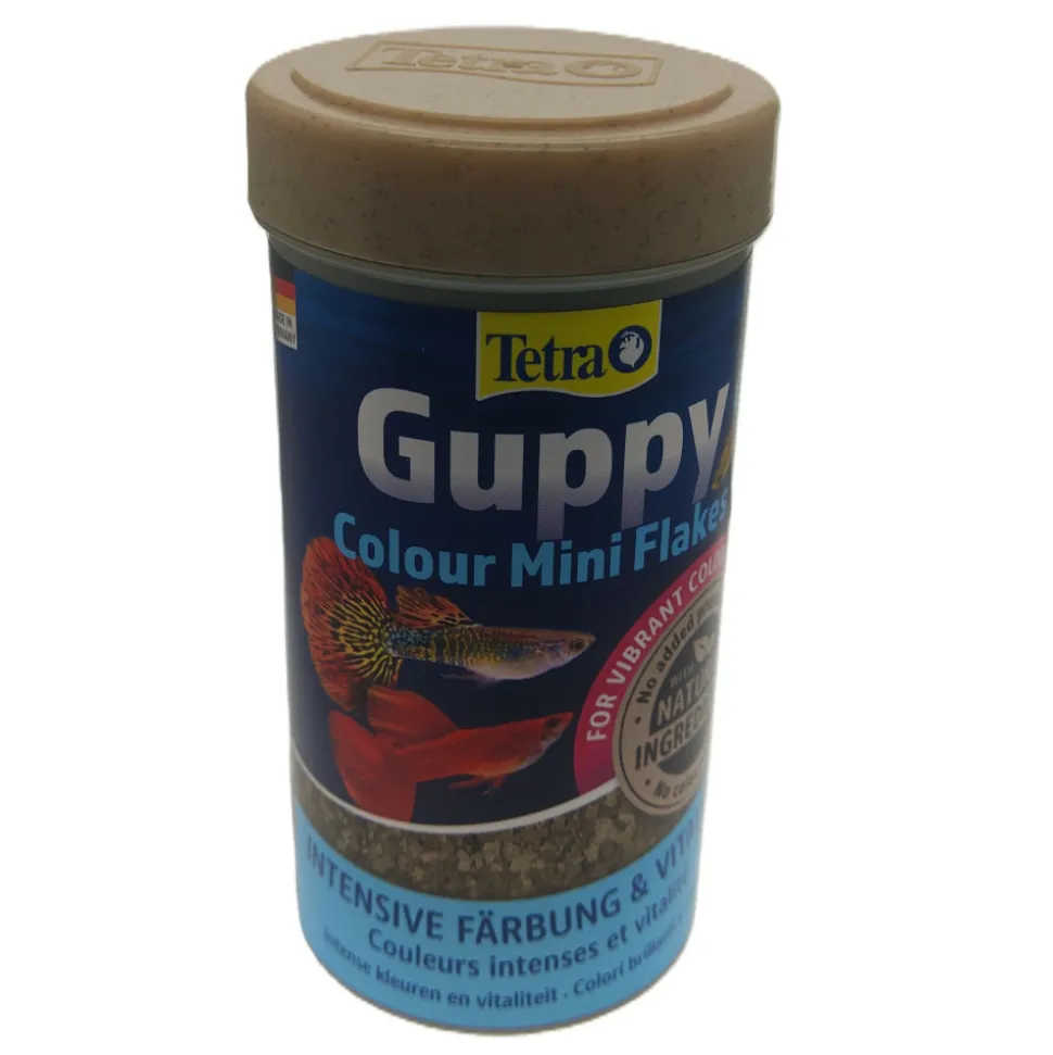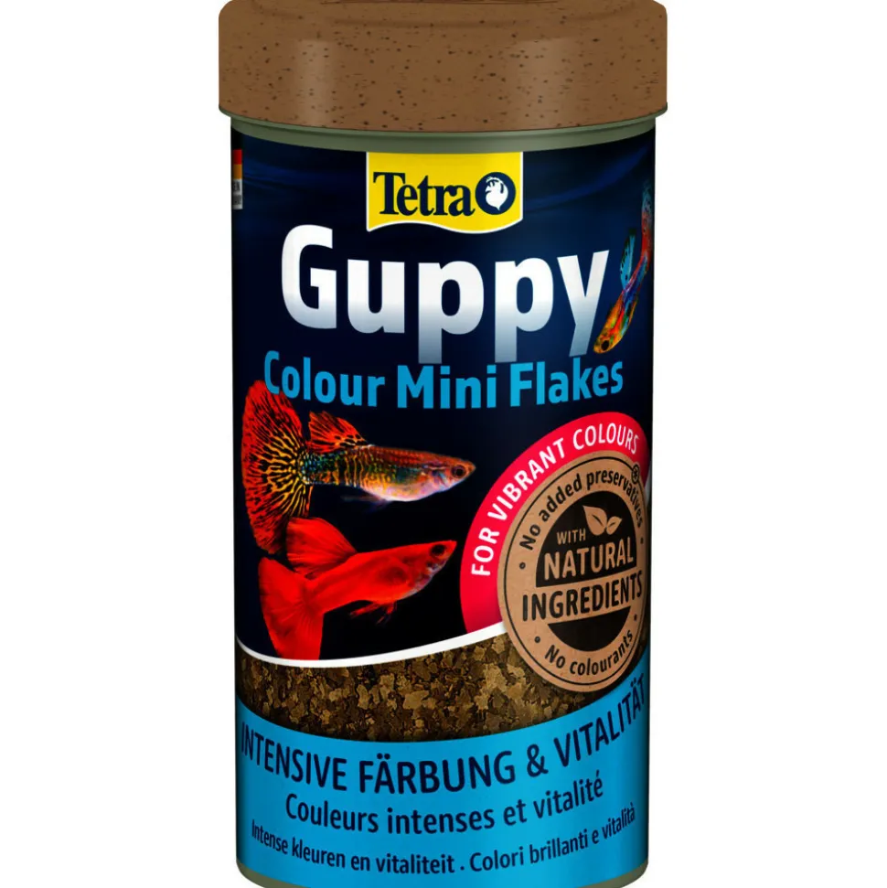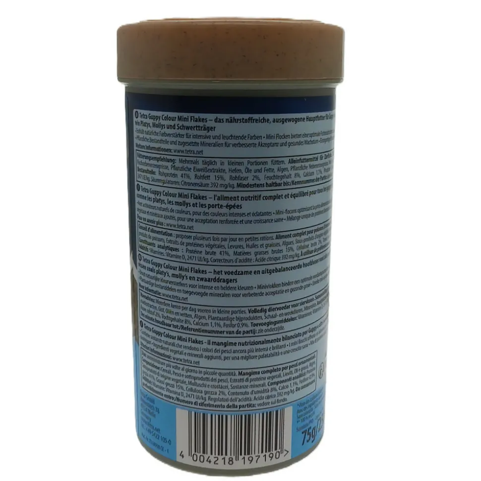 Guppy couleur mini flocons 75g – 250 ml Aliment pour les Guppies, platys, mollys, porte-épéesAliment complet enrichi en activateurs de couleurs pour tous vos guppies.Ce produit est enrichi en activateurs naturels de couleurs pour des couleurs éclatantes.Il se présente sous la forme de mini flocons spécialement adaptés aux petites bouches des guppies et autres poissons vivipares.Ils offrent une forte teneur en végétaux et en oligo-éléments essentiels, pour une appétence et une croissance renforcées!dimension boite ø 6 cm x 11.5 cm poids du produit emballée : 95 gGuppy couleur mini flocons 75g – 250 ml Aliment pour les Guppies, platys, mollys, porte-épéesAliment complet enrichi en activateurs de couleurs pour tous vos guppies.Ce produit est enrichi en activateurs naturels de couleurs pour des couleurs éclatantes.Il se présente sous la forme de mini flocons spécialement adaptés aux petites bouches des guppies et autres poissons vivipares.Ils offrent une forte teneur en végétaux et en oligo-éléments essentiels, pour une appétence et une croissance renforcées!dimension boite ø 6 cm x 11.5 cm poids du produit emballée : 95 gComposition : Poissons et sous-produits de poissons, Céréales, Levures, Mollusques et crustacés, Extraits de protéines végétales, Huiles et graisses, Algues, Sucres, Substances minérales.Constituants analytiques : Protéine brute 44,0%, Matières grasses brutes 8,0%, Cellulose brute 2,0%, Teneur en eau 6,0%.Additifs : Vitamines: Vitamine D3 3170 UI/kg. Oligo-éléments : Manganèse (sulfate de manganèse (II), monohydraté) 32 mg/kg, Zinc (sulfate de zinc, monohydraté) 19 mg/kg, Fer (sulfate de fer(II), monohydraté) 13 mg/kg. Colorants, Antioxygènes, Conservateu