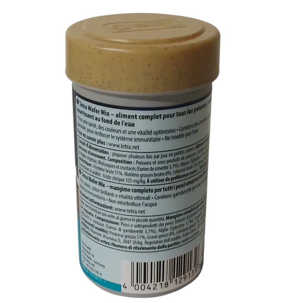Tetra Wafer mix nourriture poisson de fond et crustacés 48 g soit 100 mlalimentation équilibrée à tous les poissons de fond et crustacés.recommandés pour les poissons de fond carnivores (Corydoras, Botia,…), herbivores (Loricaridés) et les petits crustacés (crabes, crevettes,…).Il contient des crevettes et des algues spirulines garantissant la meilleure alimentation possible. Aliment completSystème immunitaire renforcé et vitalitéCroissance renforcéePour l’alimentation optimale et variée des poissons de fond et crustacésEnrichi en algues spiruline pour accroître la résistance des poissonsGrâce à leur consistance solide, les wafers ne troublent pas l’eauForme de l’aliment wafer pastilledimension ø 4.5 , hauteur 8 cm poids du produit 59 gr