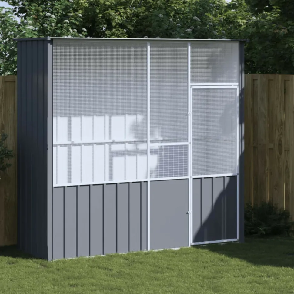 Cette cage à oiseaux offre un endroit confortable pour que vos oiseaux volent et jouent en toute sécurité. Cadre robuste : grâce à la construction robuste en acier galvanisé, ce nichoir est durable et conçu pour durer.Clôture soudée : la volière est équipée d’une clôture soudée qui évite les méfaits et les accidents inattendus. De plus, elle vous permet d’observer vos oiseaux tous les jours et leur garantit un large champ de vision et suffisamment d’air frais.Grande espace d’activité : la volière offre à vos oiseaux un vaste espace d’activité pour se promener, jouer et voler facilement. En outre, elle convient également à d’autres petits animaux tels que les lapins, les canards, les poulets, les oies, etc.Sécurité supplémentaire : la porte à charnière avec un système de verrouillage verrouillable de la cage à perruches assure une sécurité supplémentaires pour vos oiseaux. Couleur : anthraciteMatériau : acier galvaniséDimensions : 215 x 78 x 200 cm (l x P x H)Dimensions de la maison : 207 x 68 x 200 cm (l x P x H)Dimensions de la porte : 57 x 160 cm (L x l)L’assemblage est requisCouleur : anthraciteMatériau : acier galvaniséDimensions : 215 x 78 x 200 cm (l x P x H)Dimensions de la maison : 207 x 68 x 200 cm (l x P x H)Dimensions de la porte : 57 x 160 cm (L x l)L’assemblage est requis